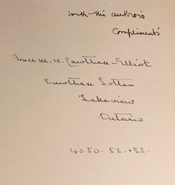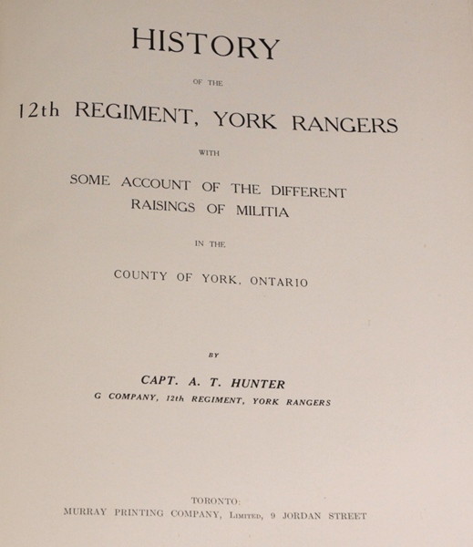 History by Capt. A.T. Hunter produced for regimental use. Cover shows wear but complete. Author has written with complements to a member of the Toronto Cawthra family dated 1950, 1952 and 1953.