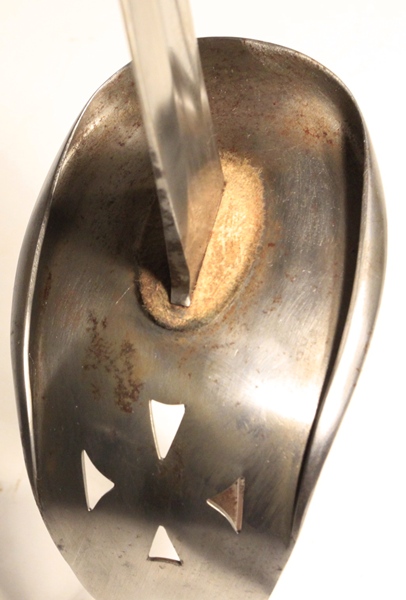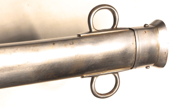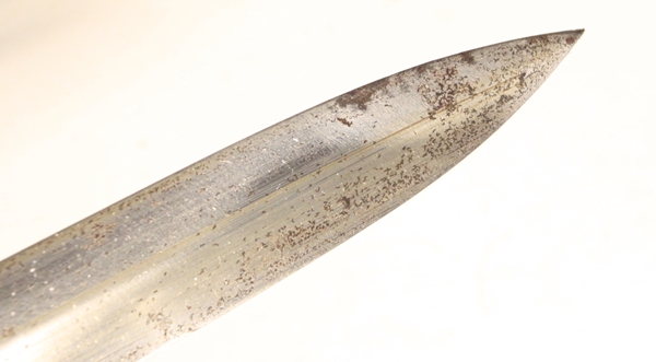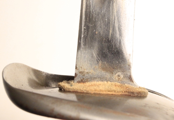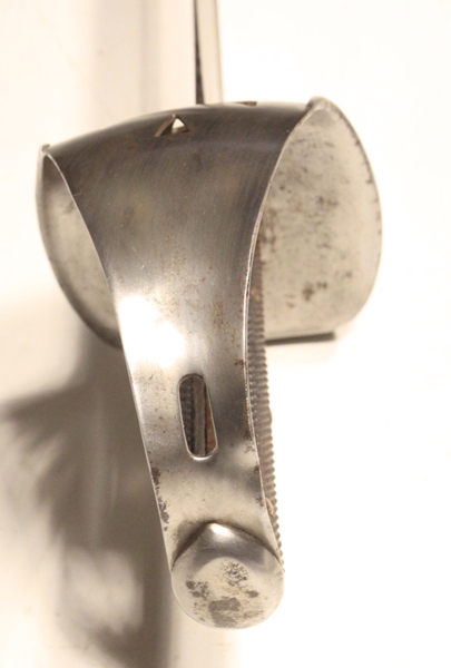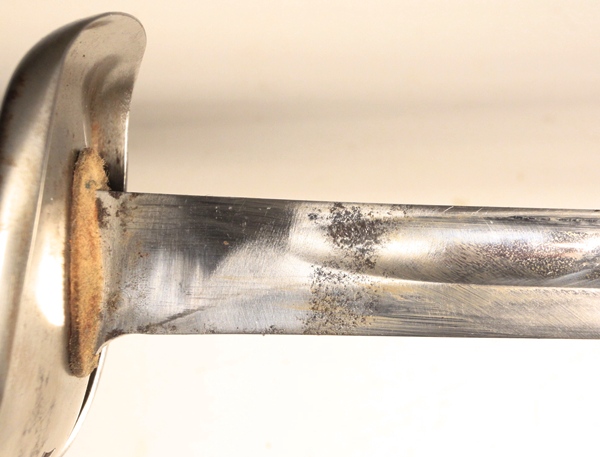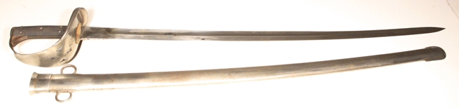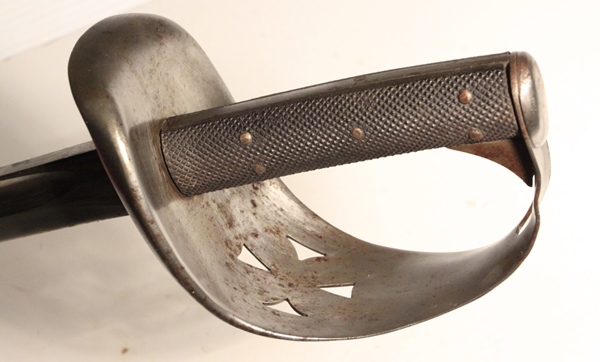 Cavalry Sword with the edges of the handguard bowl turned out to prevent fabric damage on uniforms. The back of the handguard is reinforced with a large metal right angle plug. Blade and scabbard are unmarked indicating private purchase for volunteer or Militia use. There is no model marking on the spine so safe to consider this the 1890 pattern sword. Blade length is 34 ¾ inches and overall length 40 inches.