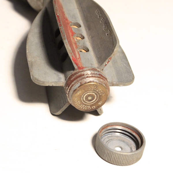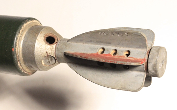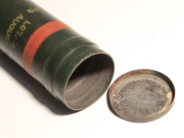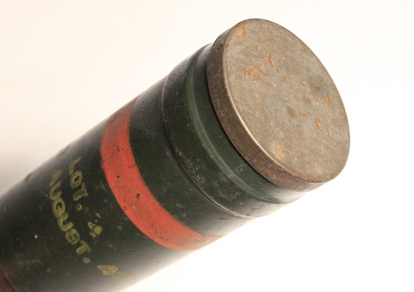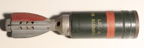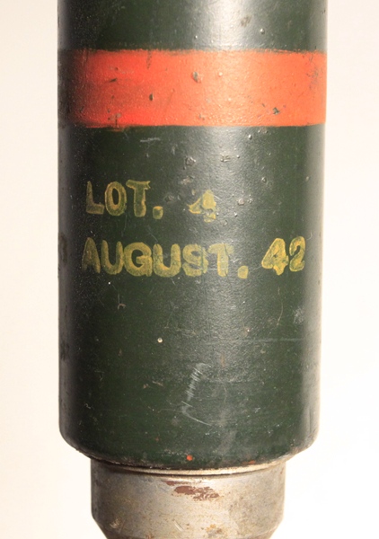 Fired smoke round, empty and inert. Complete with top cap, base cap and still contains fired launching cartridge. Body has original paint and is well marked with one red stripe and dated August 42.
