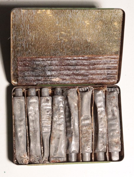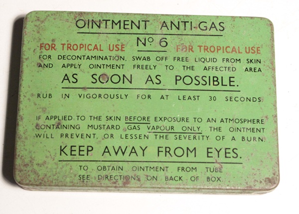 Original British Army anti-gas ointment No. 6. Used to treat wounds and blistering from mustard gas attack. All eight tubes are present and intact.