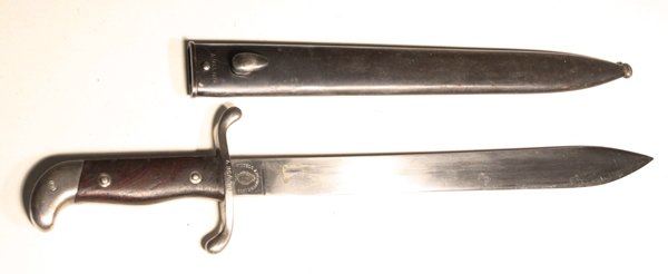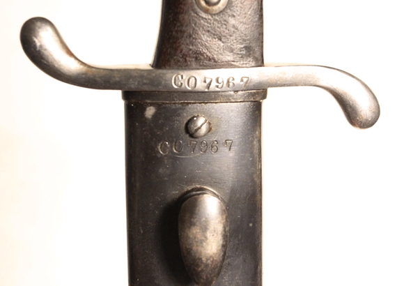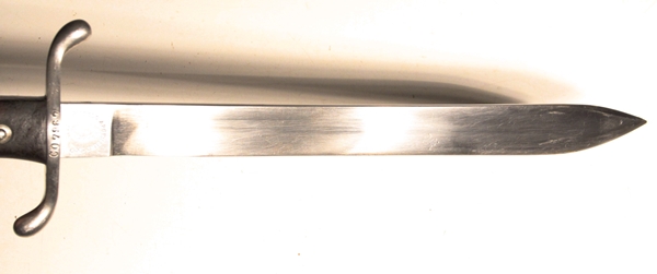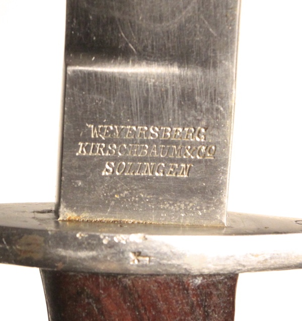 Single edge, unfullered blade, no mounting slot for rifle, not a bayonet. Made in Germany by Weyersberg, Kirschbaum & Co., Solingen. Uncommon to have unaltered Argentine crest on ricasso, these are usually ground off. Pommel marked RA for Republic of Argentina. Steel scabbard matches in serial number to bayonet. VG+ condition.