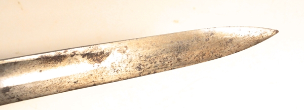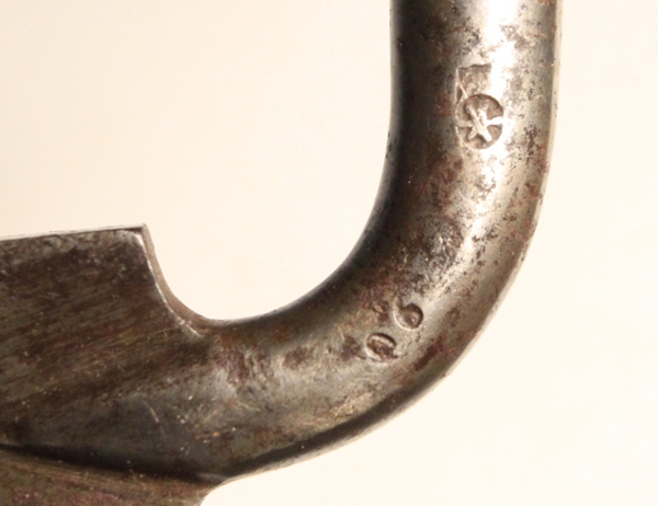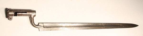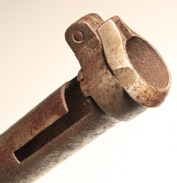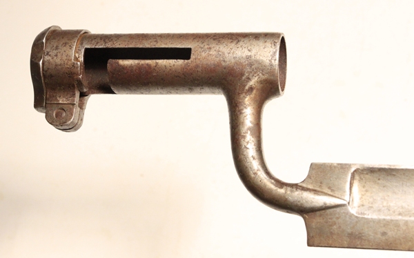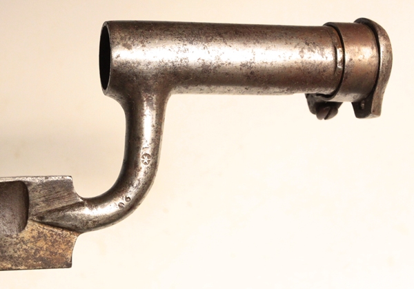 Used on the Austrian Model 1849 Kammerbuchse (chambered rifle). Marked with Vienna Arsenal mark, 6 armed star. Socket has long “L” shaped mounting slot and heavy adjustable rear locking ring. Many of these bayonets were used on Austrian rifles purchased by the US Ordnance Department for the US Civil War. Blade length 23 5/8 inches and fullered on both sides with false edge extending about 6 inches from tip. Overall length 28 inches. Socket length 4 ¼ inches. Muzzle ring is 24mm. Original condition with some staining from spots of corrosion. No scabbard.