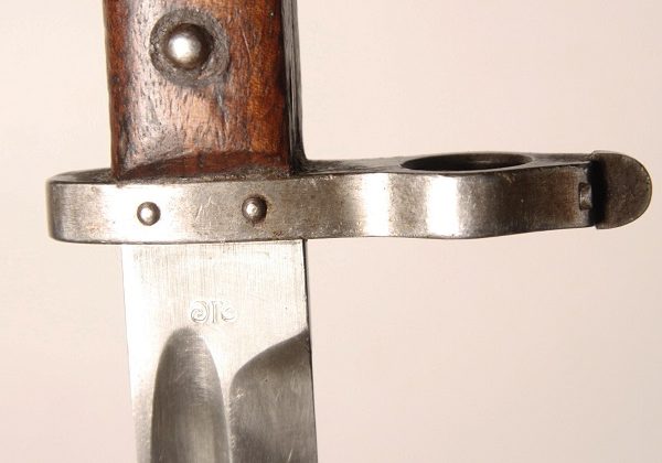 Unusual bayonet for the Model 1895 Mannlicher carbine or short rifle with a sight blade mounted into a dovetail slot on top of the muzzle ring. Original, very good condition bright upward cutting blade. Unusual marking on ricasso in script, opposite side a starburst, likely out of service cancellation stamp out of Eagle. Number 55 15 on crossguard. Scabbard in very good condition and is not marked. Interesting and uncommon bayonet in quite good condition.