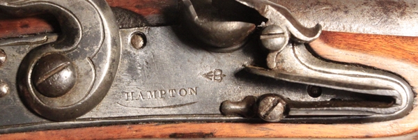 Frequently referred to as Indian Allies or 1813 Indian Contract pistols this is an example of the British Ordnance department using various Birmingham based manufacturers to produce a British Ordnance pistol that was given to the indigenous people in Canada to strengthen Britian’s defence of Canada during the War of 1812. Barrel 9 inches, overall 15 inches. Bore .65 inch smoothbore, clear with signs of corrosion. Lock maker marked Hampton with crown and arrow ordnance mark. Barrel has two British proof marks and one on barrel tang. Strong spring and works well on full and half cock. Very researchable and uniquely Canadian.