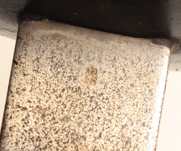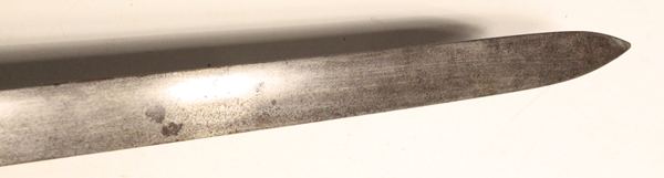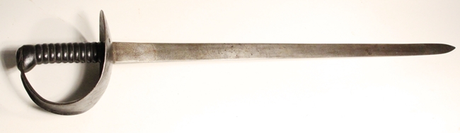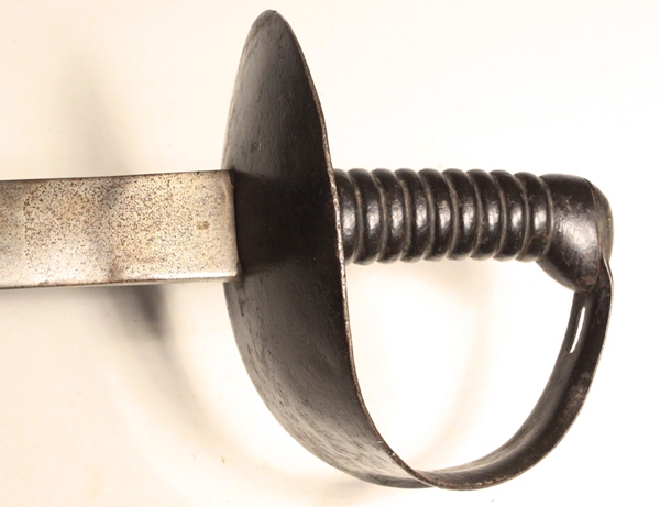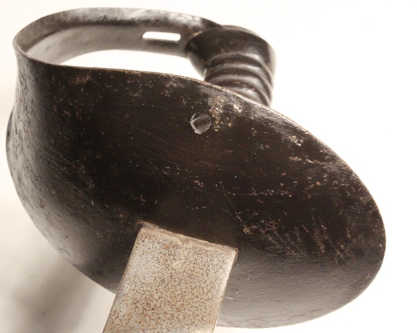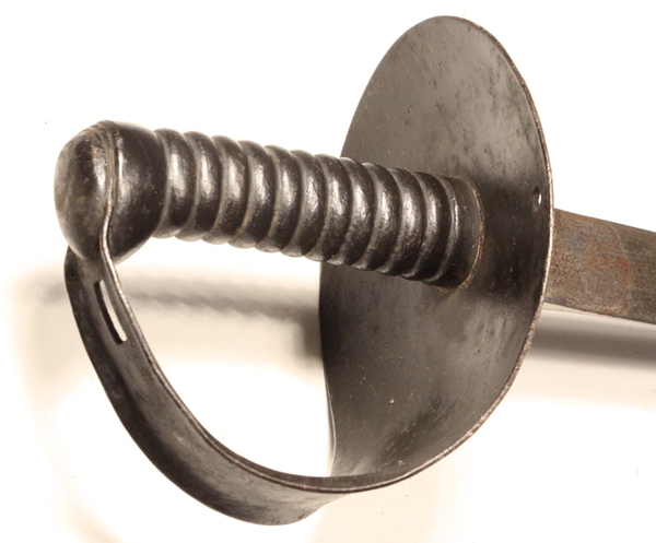 Later pattern naval boarding cutlass with full bowl handguard. Ricasso British proof marked Crown over 16. Blade is 29 inches long, overall length 34 inches. Blade has spear point and single edge, no double edge near the point. There is a hole in the handguard on one side, reason unknown.