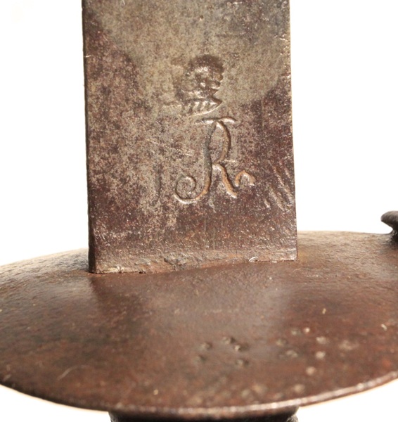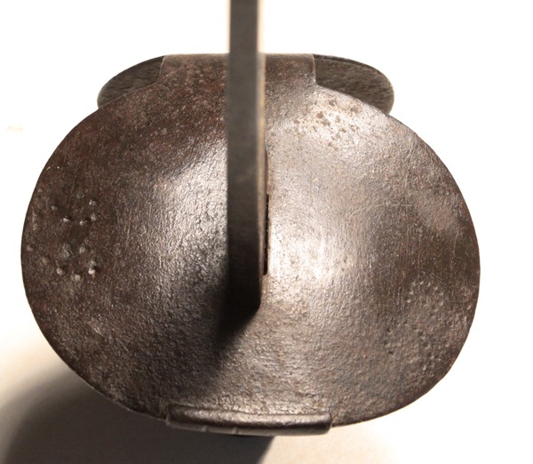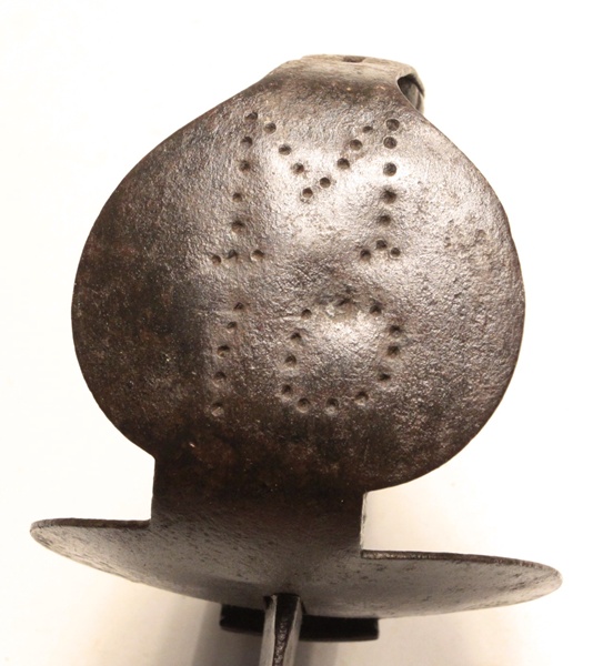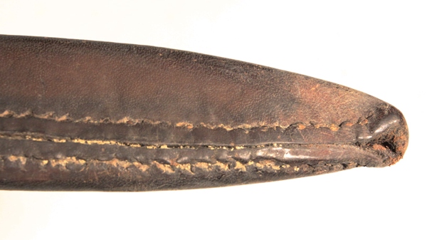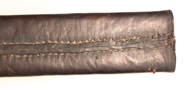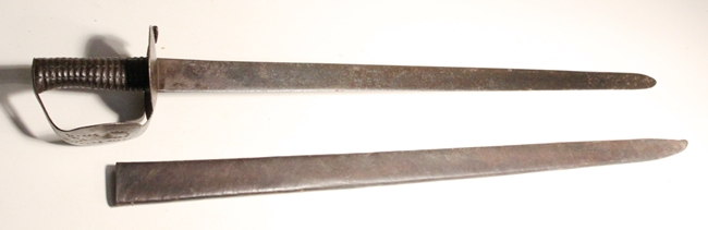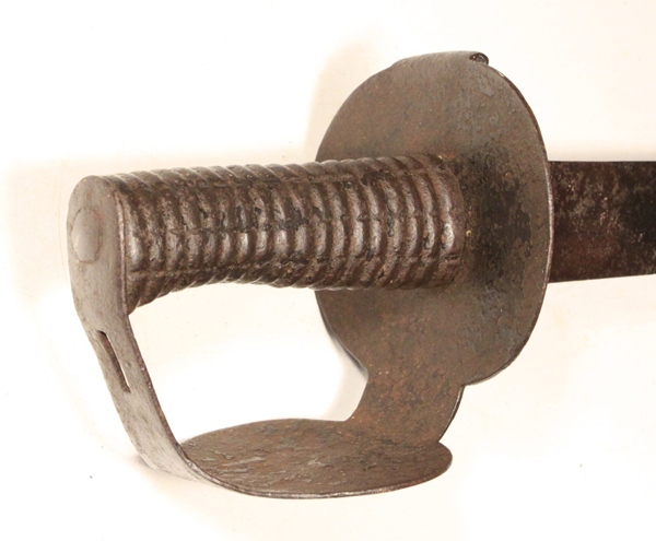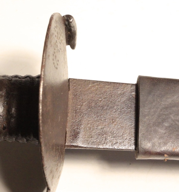 This is the first pattern naval cutlass issued to British seamen. Original with Royal Cypher GR marked into the blade and still visible. Blade is very good with uniform patina. Overall length 34 inches, blade is 29 inches long. Handle is all steel with some original black paint remaining. The figure 8 handguard is marked with dots stamped into the metal as shown including a large M 10. Comes with uncommon leather scabbard that does not fit up to the handguard but leaves a gap a shown in photo.