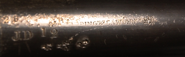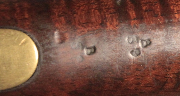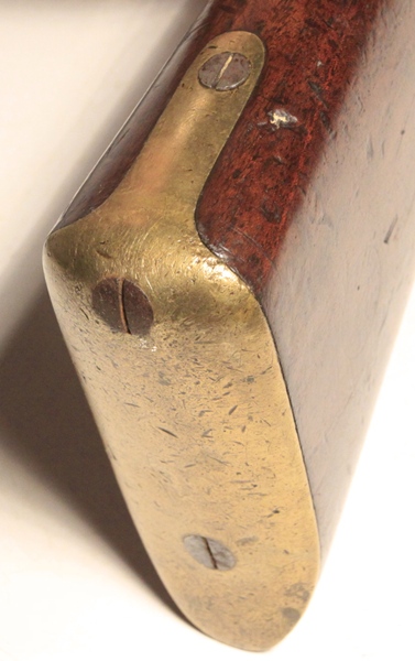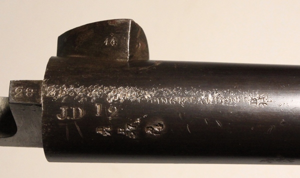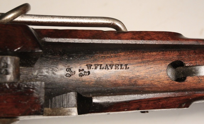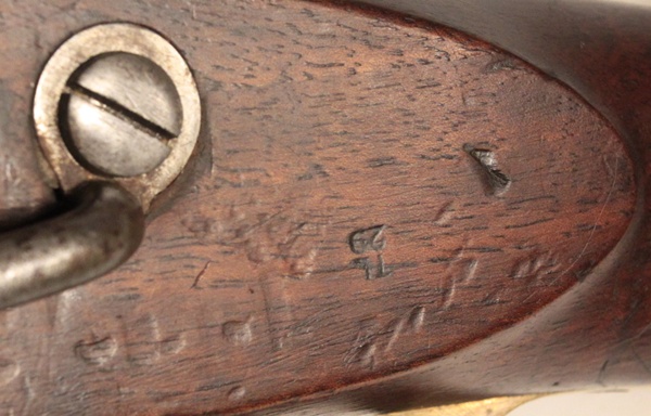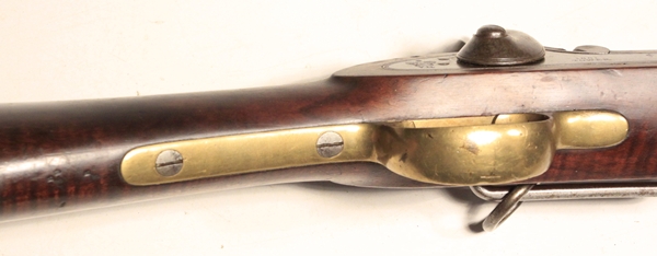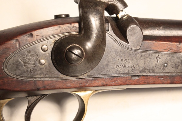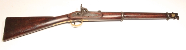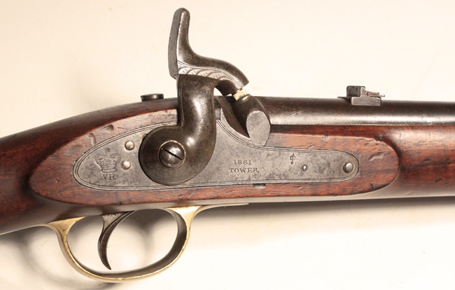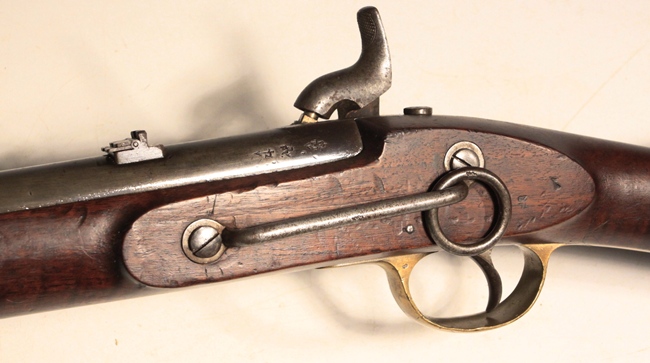 P1856 Cavalry Carbine. Lock marked Crown over VR and TOWER 1861 with crown and arrow viewer mark. Barrel is 21 inches, .577 inch bore and is Good – Very Good condition, shiny with strong rifling and evidence of light corrosion. Captive ramrod and swivel mechanism in very good condition. Cavalry sling bar and ring on left side in very good condition. British proofs on stock and barrel.