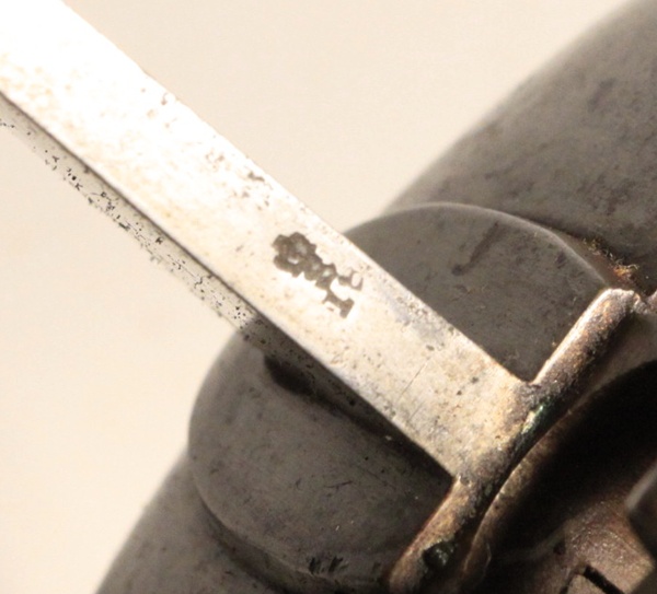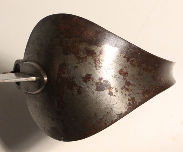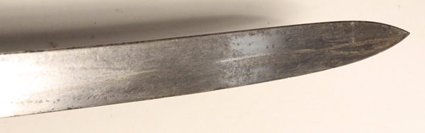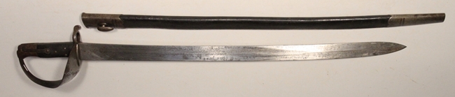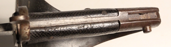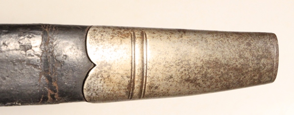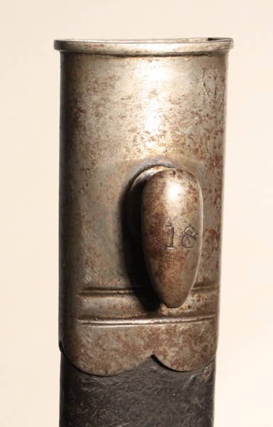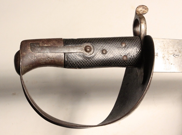 Second Pattern 1859 naval bayonet with cross hatching pattern impressed into the hard leather grips. Unfullered blade 27 inches long and bayonet is 32 ½ inches overall length. Made on contract by German blade maker Weyersberg Bros. and bears their knight’s head logo as well as Solingen proofs Crown over S over numbers. Original, in very good condition. Steel mounted leather scabbard is very good condition with age patina on steel parts.