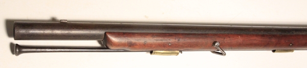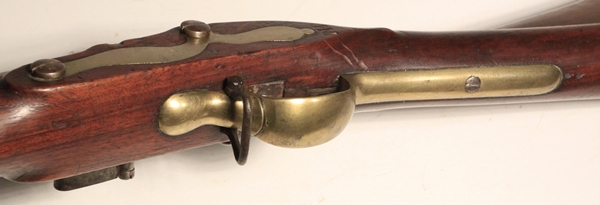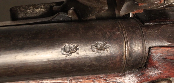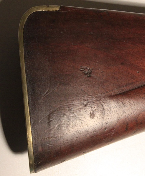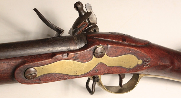 Guaranteed original. Lock TOWER marked, Crown over GR, crown with arrow viewer’s mark. Right side of butt stock has clear stamping Crown/GR in script and there are two small proofs in the stock at the end of the trigger guard tang that do not show detail. The letters I.M stamped in the stock at the end of the flat left sideplate. Barrel has two period proofs that have been overstamped with another proof at some point. 37 inch smooth bore barrel, .75 inch bore, clear with light corrosion. Original ramrod is faintly marked and ramrod channel bears markings as shown including the name clearly stamped MARWOOD. Exceptional original condition Sea Service Musket. Antique, no license required to purchase.