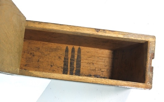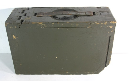 Original US issue wooden box that mounts on the 1917 tripod. Very good condition with leather handle.