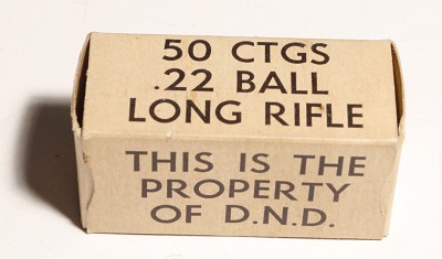 Beige cardboard boxes marked DND Property. One is 50 rounds .22 LR in typical DOMINION arsenal yellow plastic tray. One box is 50 rounds loose packed. Interesting items recalling days of militia use of .22 Training rifles. Price is for the two boxes shown, that’s all there is. PAL required to purchase.