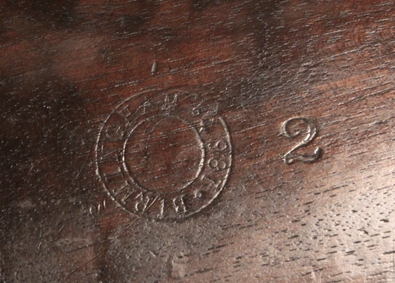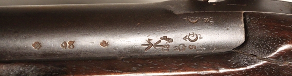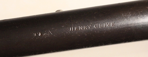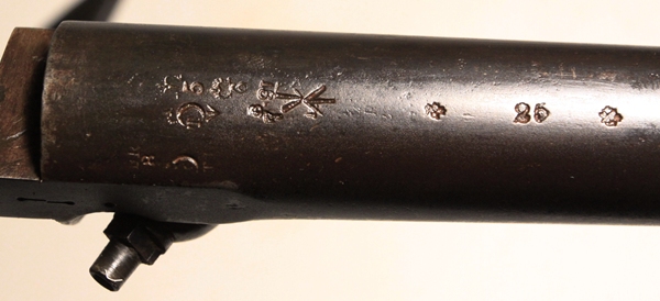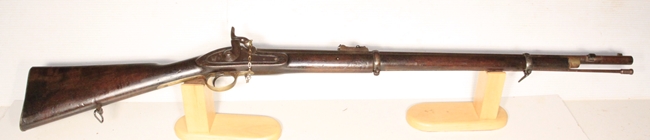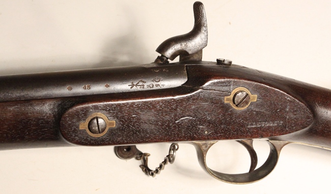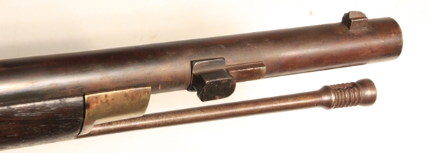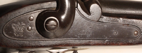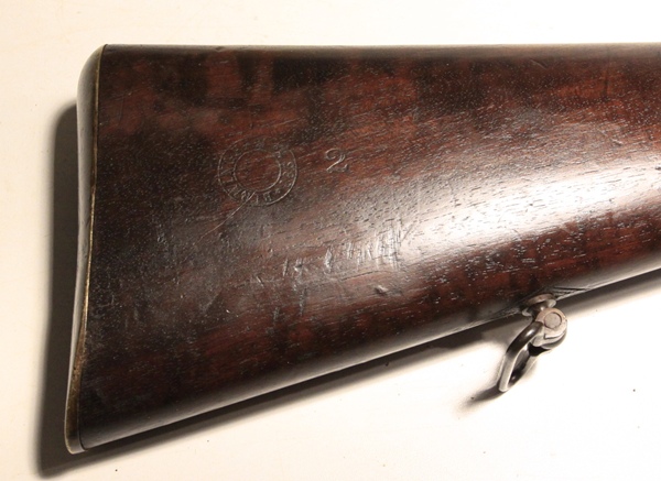 Derived from the Pattern 1853 musket system with bar on barrel bayonet mounting. Barrel length 31 ½ inches. Bore .58 inch and in poor condition, some shine but corrosion and no rifling. Brass fittings indicate British Navy use. Lock marked Crown over VR, 1862 TOWER. Transitional rifle of the Pattern 1856/1862 type. Researchable. Birmingham stock cartouche bears date 186(2?) and the name J. Fogarty is stamped into the stock at the wrist. Barrel well marked with proofs and sold out of service stamp. Butt tang is well marked V over Gc over E2 and rifle number 428. The V usually designates a volunteer unit and the Gc the area or county. Numerous setup markings on the underside of the barrel.