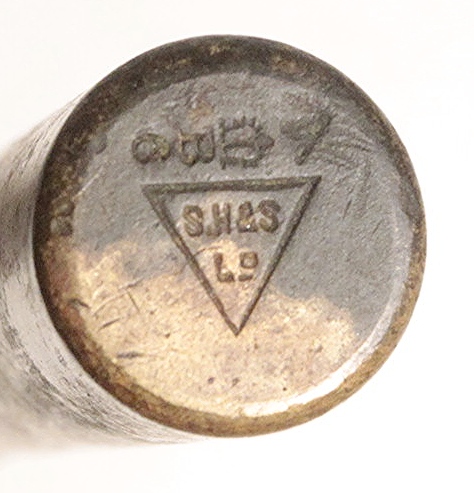 World War One era Enfield oiler for butt stock of Lee Enfield rifle. Brass with oiling spoon in used very good condition. Nicely marked with British proof, broad arrow and marked SH.& S. in a triangle for either S. Hall & Sons, Ltd. or S. Heath & Sons, Ltd. Unsure of which.