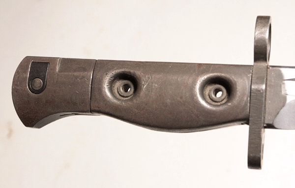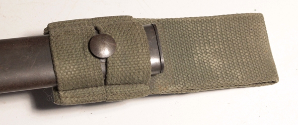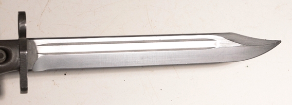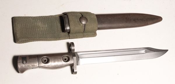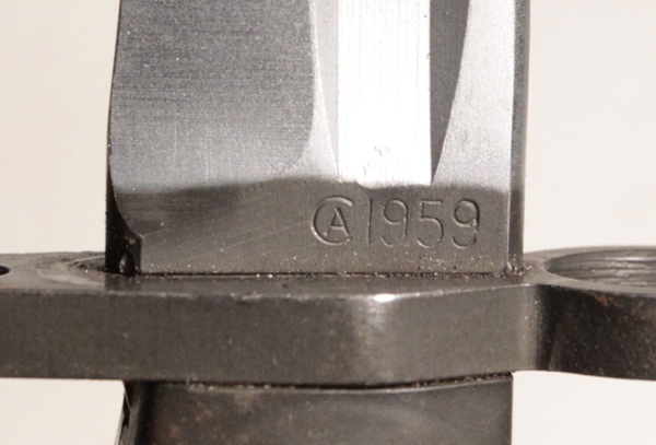 Canadian knife bayonet for use on the FN C1 rifle. Manufactured in Canada by Canadian Arsenals Limited, formerly Long Branch Arsenal. 1959 dated. Issued and used. Web frog included.