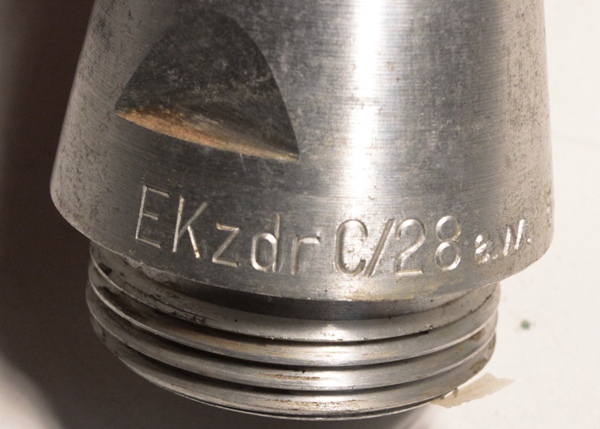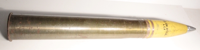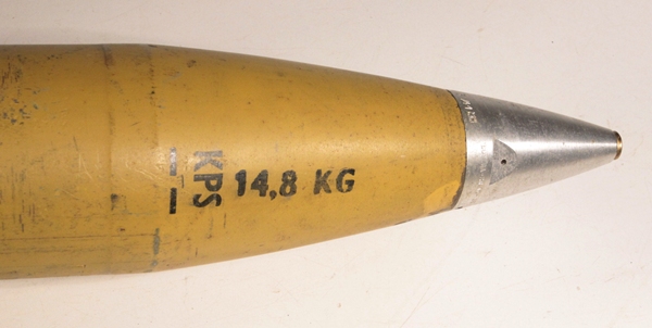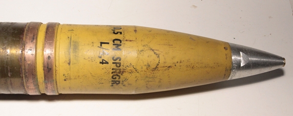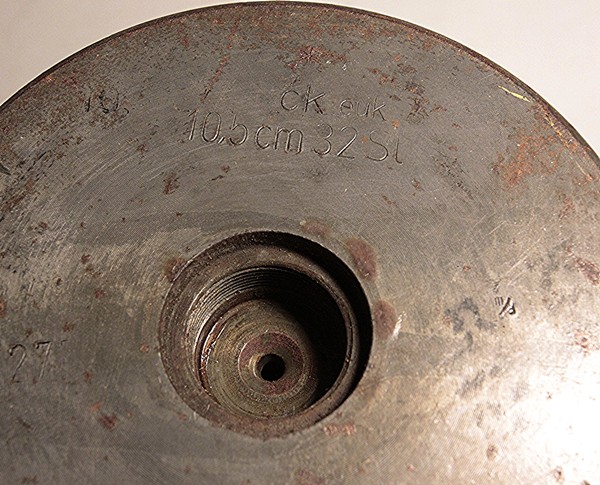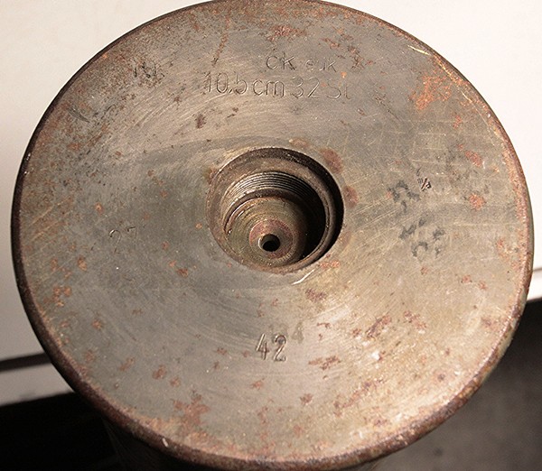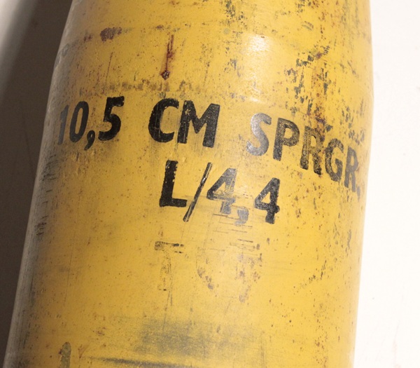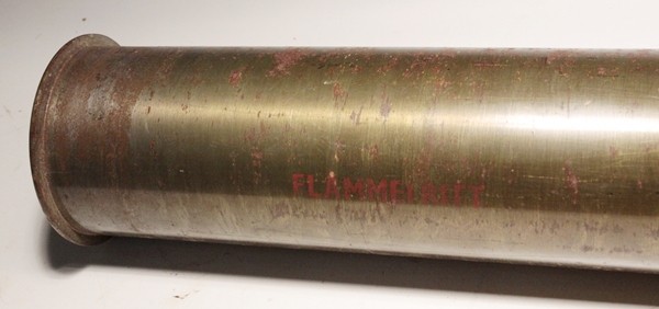 Extraordinary display item almost 42 inches tall. Projectile marked 10.5 cm Sprenggranate Länge/4,4, indicating this is a 10.5cm (105mm) high explosive round usually with tracer (HE-T) and used for generally bombardment using field artillery. The fuze is marked EKzdr C/28 and is a Kriegsmarine fuze used on large calibre shells on ships and shore batteries. Headstamp is ck euk over 10.cm 32 St. The projectile is fixed into the steel casing and the casing is stencilled FLAMMELRITT in red letters and treated with a brass coloured wash that has some minor corrosion.