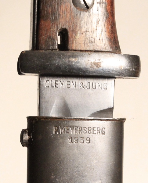 Wooden grips, spine dated 39 (1939). Maker is Clemen & Jung in 1939 dated P.Weyersberg scabbard. Blade is very good, grey-blue, unsharpened.