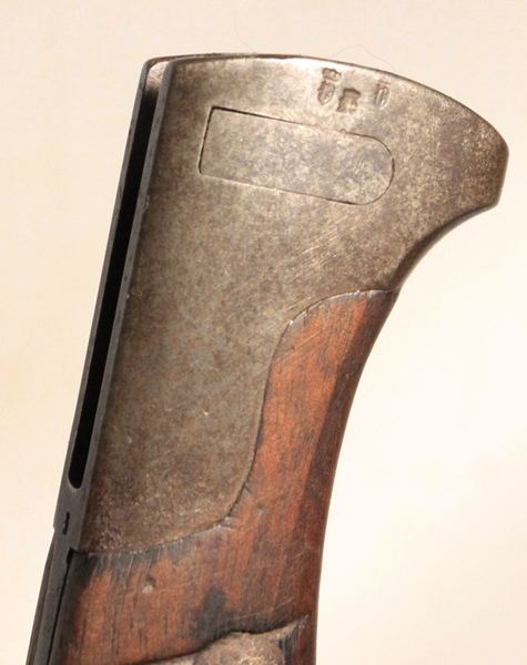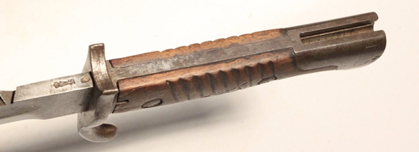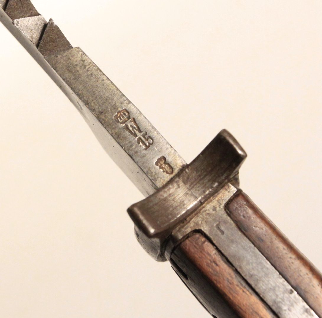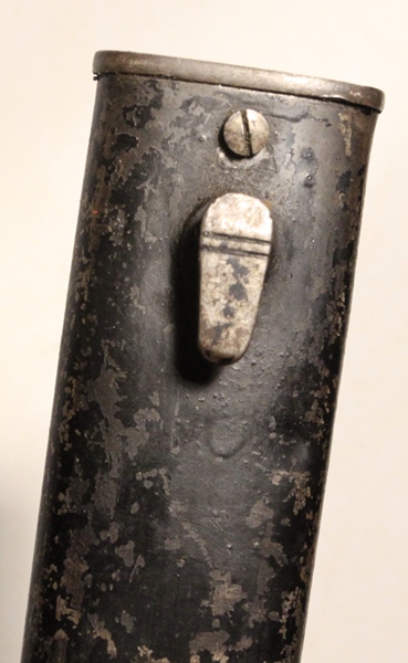 First pattern 1898/05 bayonet with “high ears” remnant of removing the muzzle ring. No flash guard on back of grip. Marked Crown over ERFURT. Spine marked Crown over W over 15 for Kaiser Wilhelm II and date of 1915. Blade is in good to very good condition, dark, no nicks, sharpened. Steel scabbard also good to very good with uniform patina and no denting and much original WW1 black paint remaining.