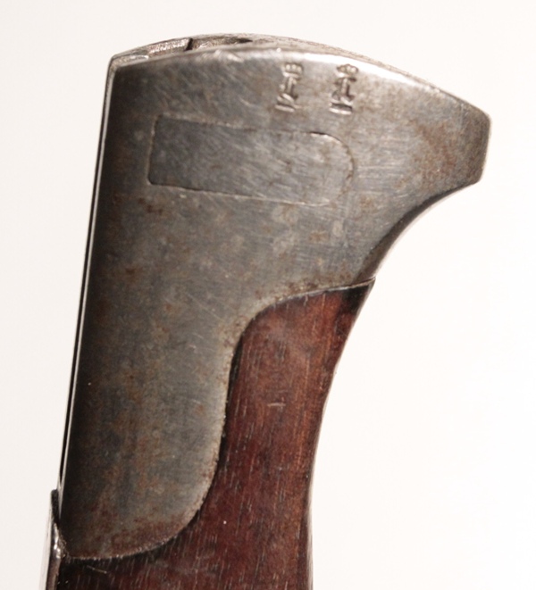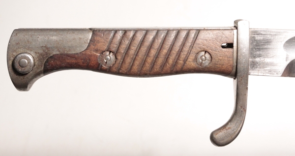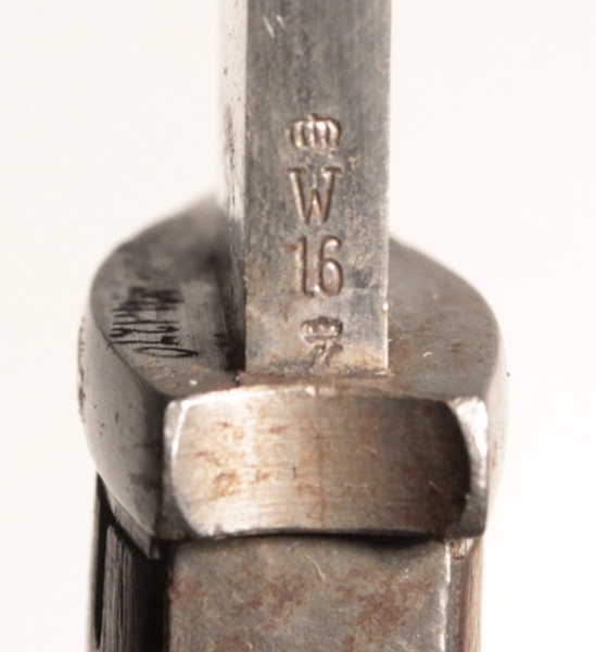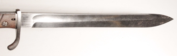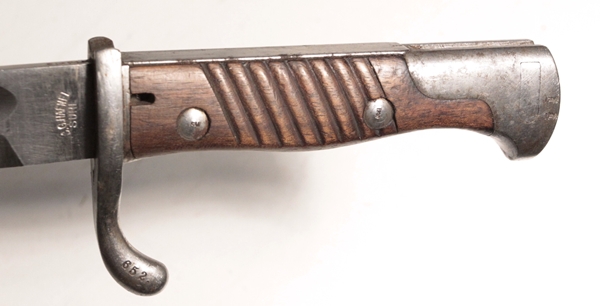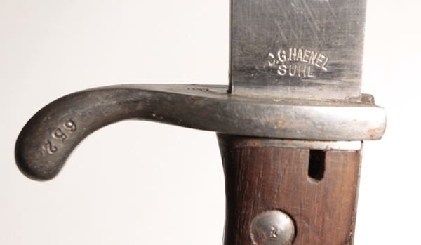 Original German WWI butcher bayonet. No scabbard. Original, very good condition. Maker C.G. Haenel, Suhl. Willhelm II cypher on spine along with frakturs and date of 16 (1916). Blade in very good condition. There is an electric pencil marking on the front of the Crossguard.