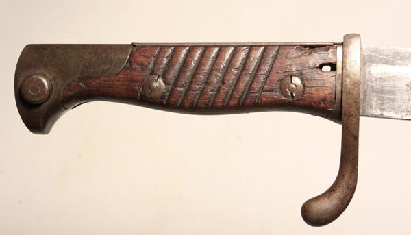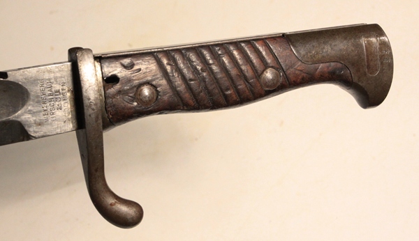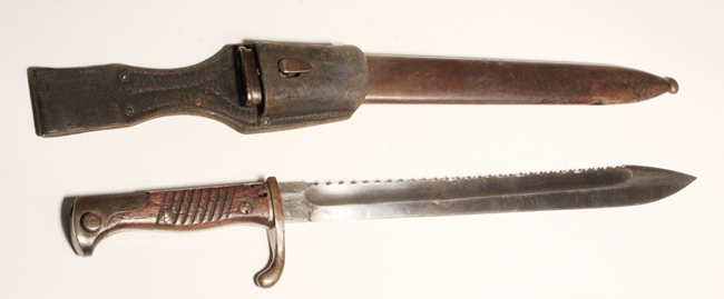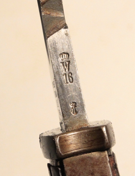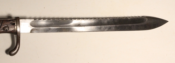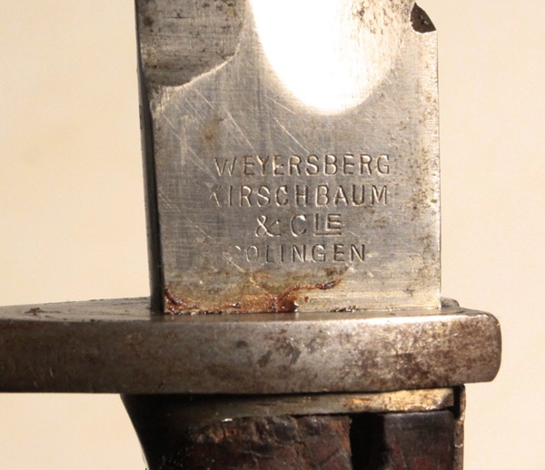 Original model 1989/05 sawback bayonet. Ricasso marked Weyersberg, Kirschbaum & Cie, Solingen. Crown over W and 16 on spine of blade, Kaiser Wilhelm, dated 1916. Blade and saw teeth in very good condition. The blade is unsharpened. Comes in steel scabbard, good condition with slight damage as shown in photo. Leather belt frog is very good condition, not marked.
