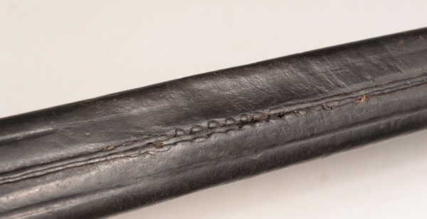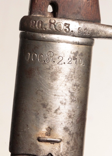 Second pattern, newer model or n/A (neuer Art) with two piece wooden grip. Made to fit the GEW 98 World War One German infantry rifle. Arsenal made at Erfurt. Crossguard regimentally marked 20.R.3.92. Scabbard locket regimentally marked differently 100.R.2.210. Spine well marked with cypher of Willhelm II and dated 1900 (00). Pipeback/quillback style blade in very good condition. Steel mounted leather scabbard is in good condition with stitches in seam coming apart sligntly as shown in photo. An iconic and very interesting German WW1 bayonet.