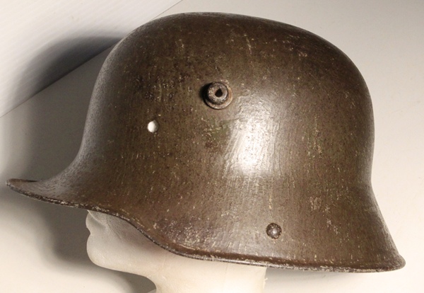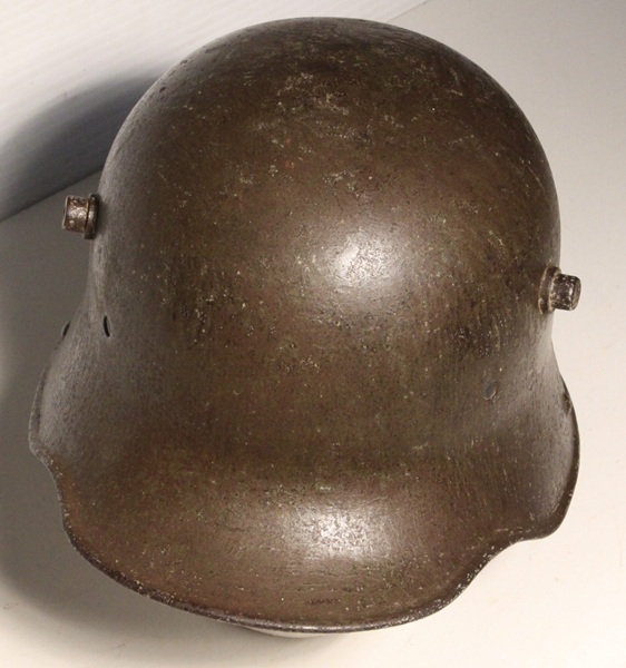 Original German WW1 Model 1916 helmet shell. Original paint on exterior. Comes with large rear rivet. Interior has post war grey paint and shows attempts to remove that paint. No markings visible.