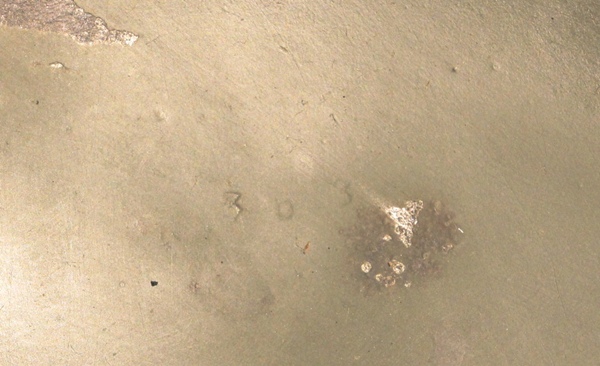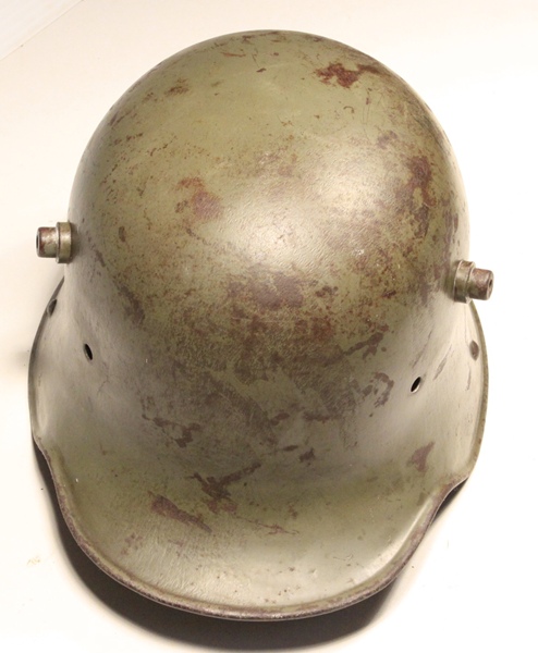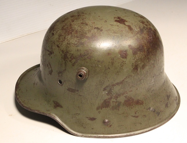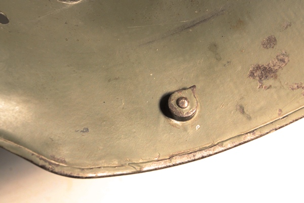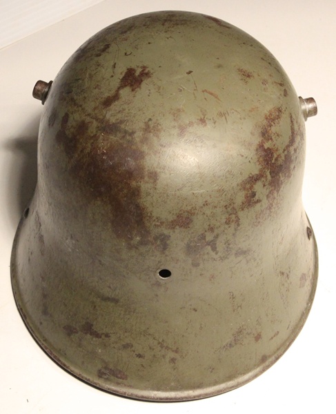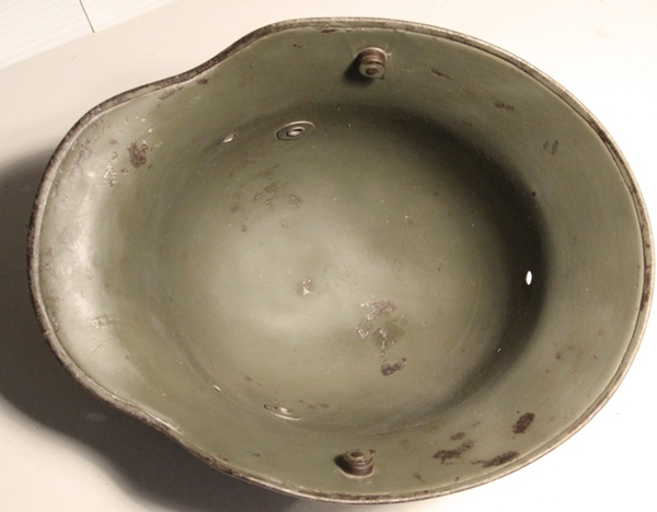 Original German WW1 Model 1916 helmet shell. Original paint on exterior. Large rear rivet is missing. Interior has post war grey paint and shows attempts to remove that paint. Steel lot numbers visible at crown, covered by paint.