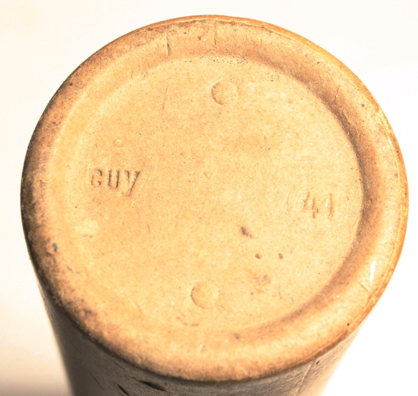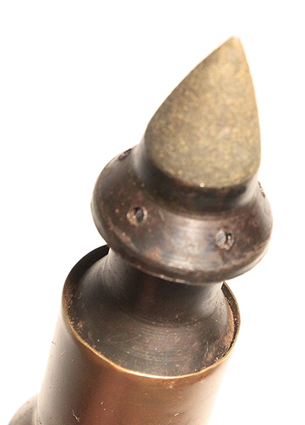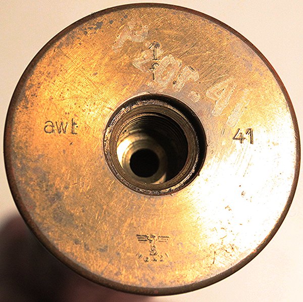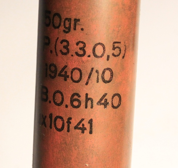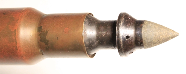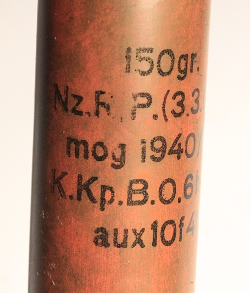 Used in the Panzerbusche 41 anti-tank gun that operated on the ‘Squeeze Bore” principle. The projectile has external flanges that were squeezed from 2.8cm at the chamber to 20mm at the muzzle thereby propelling the projectile at a higher velocity to enable greater armour penetration. Highly researchable. This specimen is original. The projectile has been removed and all propellent emptied from the case and primer removed from the case. The projectile has been reseated in the case mouth to show the flanges and crimped in place so that it is very firmly held. Case has clear stenciling as shown in photo and dated 1940. Headstamp clearly marked. Comes in a cardboard protective sleeve that is stenciled 2.8 cm Pzgr Patr. 41 and has the name of the soldier that captured this round scratched into the side Capt.\Bond.