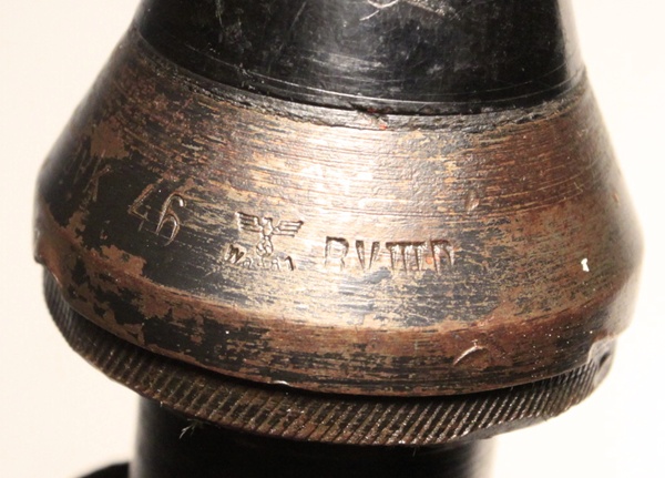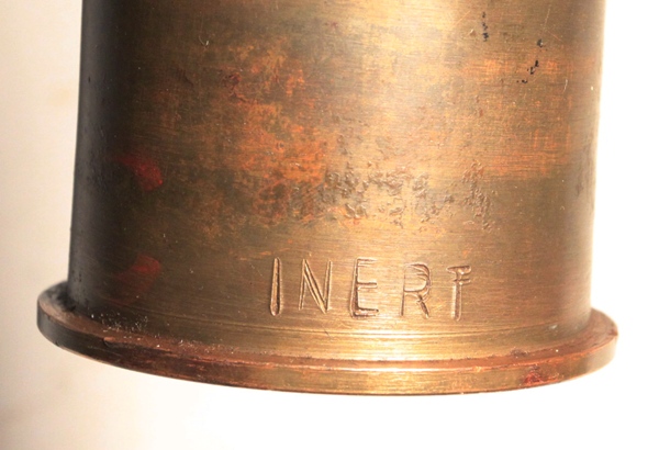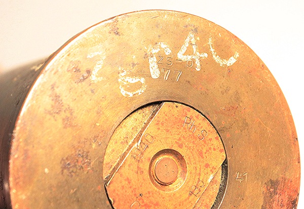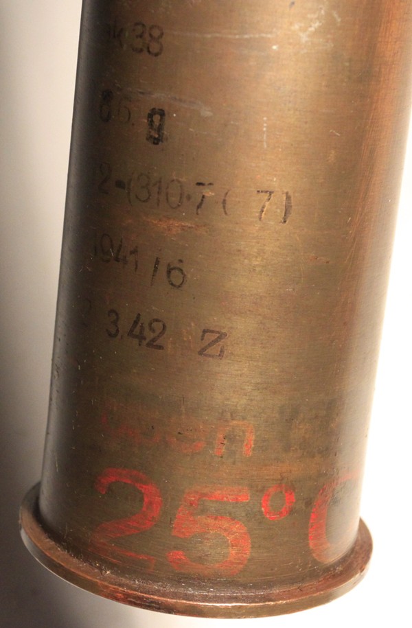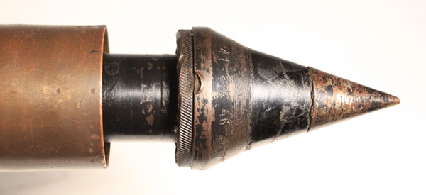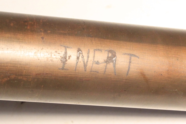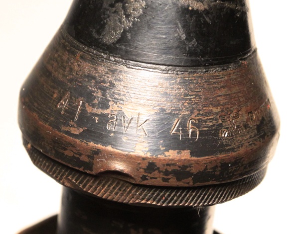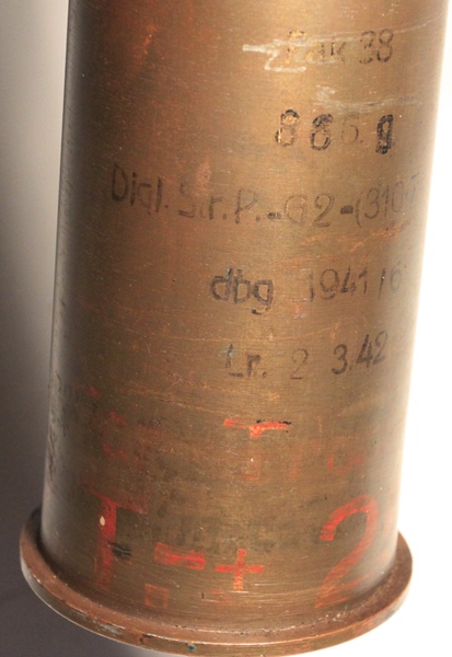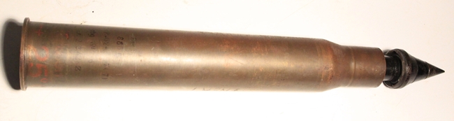 This is an original round, empty and inert. Used with the Pak 38 anti-tank gun. Frequently called 5 cm Arrowhead ammunition, it is essentially a tungsten core with ballistic cap and mild steel body. It resembles the squeeze bore ammunition in shape of projectile The British and Americans would call this a sabot round. The projectile has been removed, case emptied and reseated firmly at the first flange in the sabot so that the arrowhead design is evident. Marked INERT near the base and also scratched into the side of the casing, no doubt done in the field at time of capture.