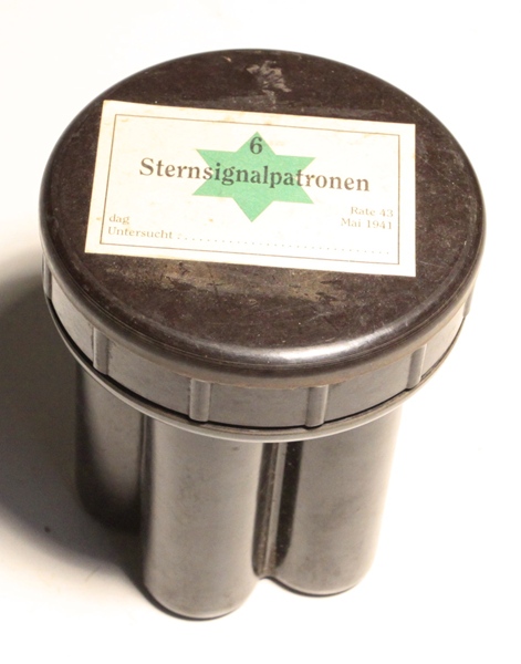 Original brown bakelite flare container holds 6 flare cartridges that are 4 inches long. Very good condition with paper label on top dated 1941.
