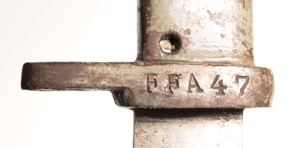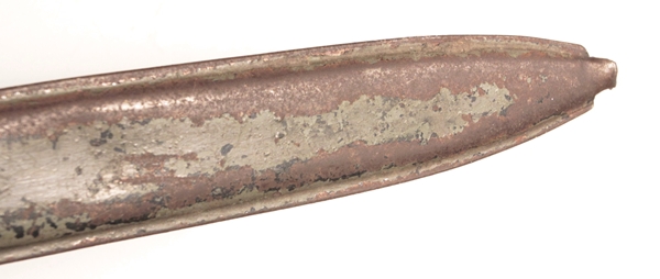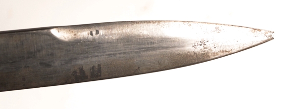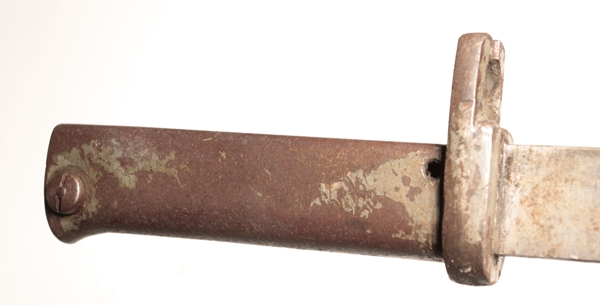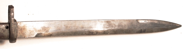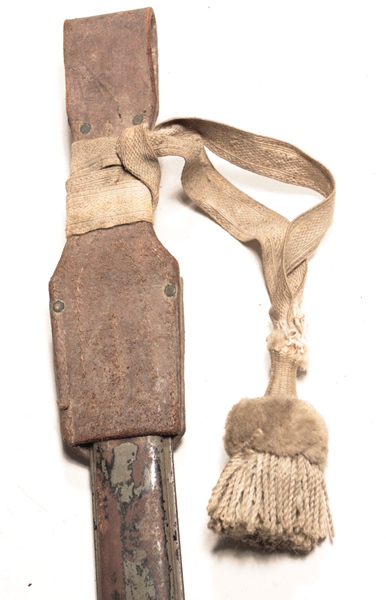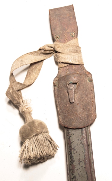 Original ersatz bayonet with steel scabbard, leather frog and including the original decorative regimental knot that came with the bayonet. Blade length 12 3/8 imches. Very tip of blade appears to be broken off.