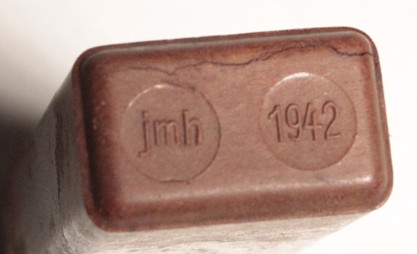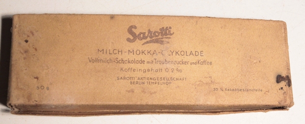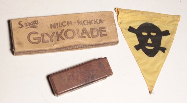 Lot of 3 items including one Minefield/Gas Warning flag 3 ½ inches across the top. These flags were issued in sets of 20 on metal poles with 75ft of yellow tape to mark mine fields. Also, chocolate bar undated and one end of toothbrush holder maker marked jmh, dated 1942.