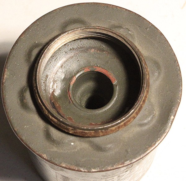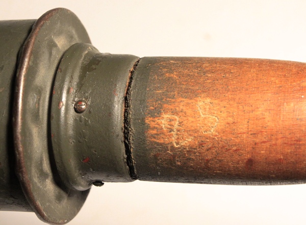 German M24 Stielhandgranate used in WWII. Very good condition. Canister has clear lettering on side and has the number “25” scratched into the paint below the label. Top is marked with the back to back R maker marks and dated 1940. Some white Waffenamt marking remains visible. The same marking is repeated on the wooden handle. Canister is skillfully deactivated, empty and inert. Cap fits tightly and comes with original ceramic ball, string and lead ball.