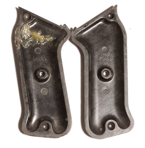 Original plastic grips for MP40 submachine gun. One grips appears to be repaired with epoxy-like glue that is visible only from the inside of the grip.