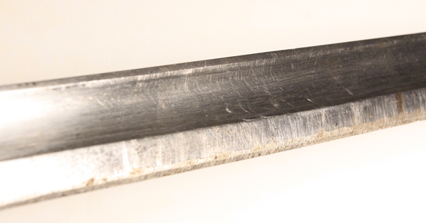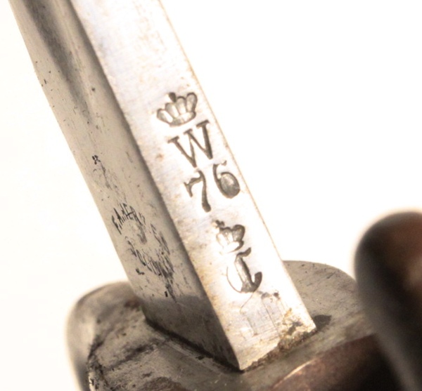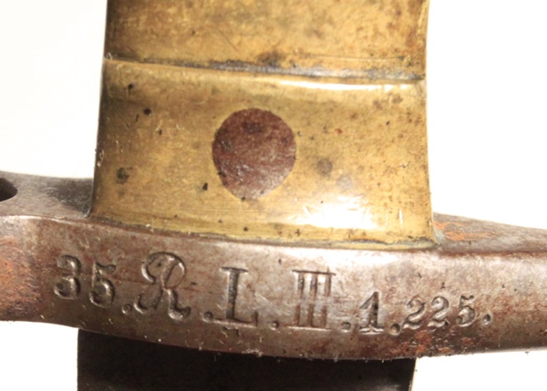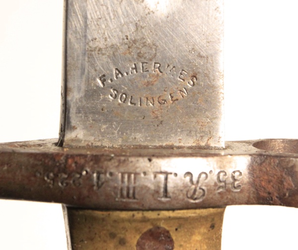 Model 1871 rifle bayonet to fit the 11mm 1871 Mauser rifle. Maker is F.A. Hermes, Solingen. Spine marked with royal cypher of Wilhelm I of Prussia and dated 76 (18761). Regimentally marked on crossguard R.L. III.1.225. Marking on locket is not matching. Very researchable. Blade is in very good plus condition, sharpened. Scabbard is very good condition with frog and knot.