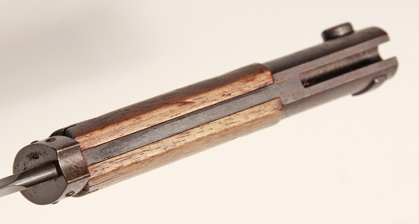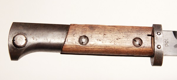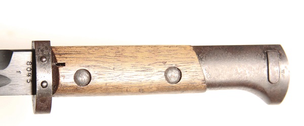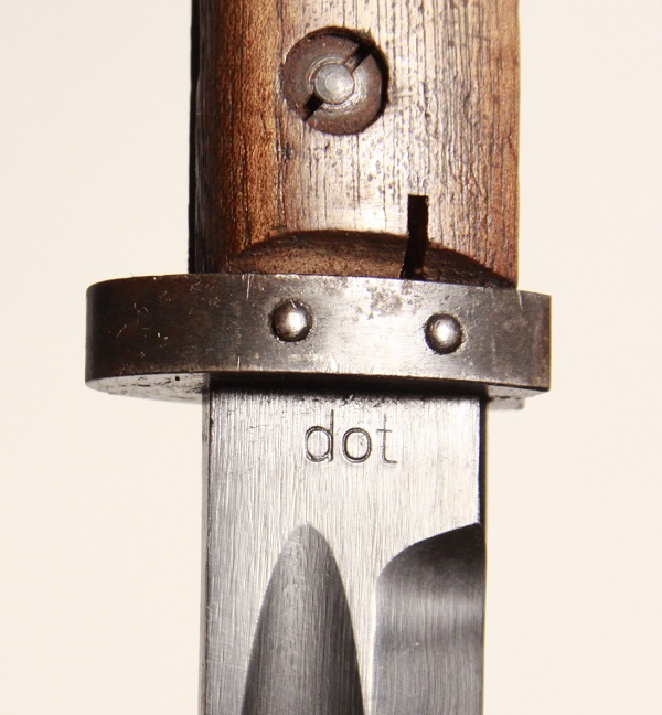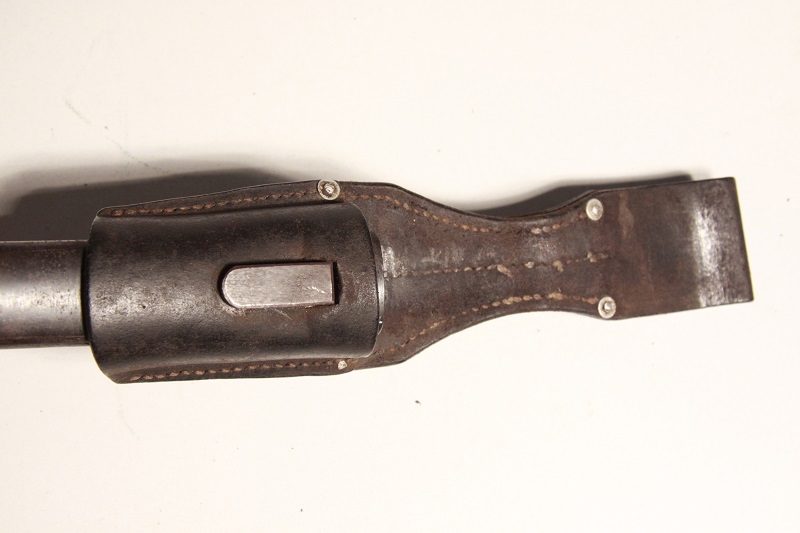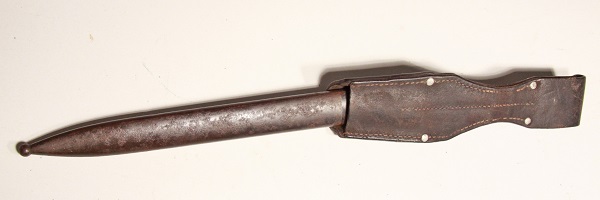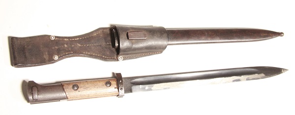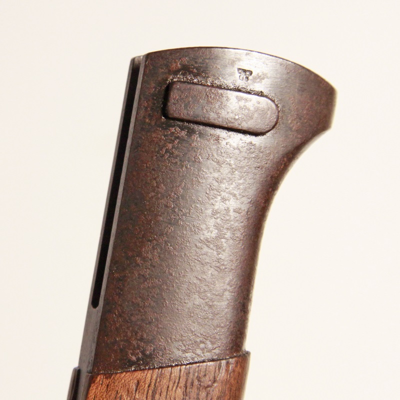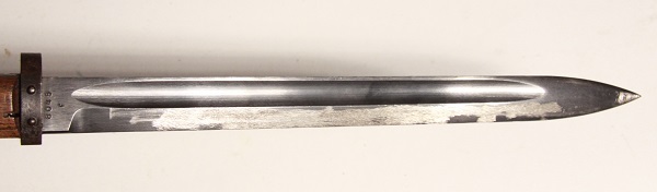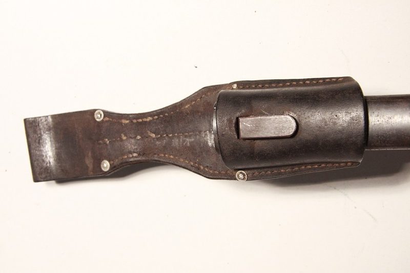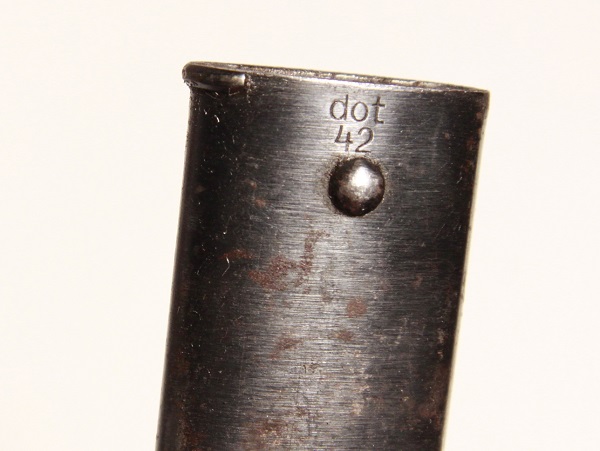 The S 24(t) bayonet was made at Waffenfabrik Brünn Werke (formerly the Československá zbrojovka a.s., Brno plant) in 1942/1943. Ricasso is marked dot, the letter code for that arms factory and so is the scabbard. There are no Czech markings on this bayonet or scabbard. Approximately 137,000 bayonets were manufactured at Waffenfabrik Brünn Werke during 1942/1943 after which production changed to the Kar 98k rifle and bayonet. A rare item. Condition is original, very good with rust patina to pommel and crossguard. Blade is very good but severely sharpened on one side most likely during the war period. Clearly marked dot on ricasso with Waffenamt acceptance stamp on pommel Eagle over 63. Scabbard also marked dot and dated 1942 (dot 42) with some rust patina on back side. Original leather bayonet frog.