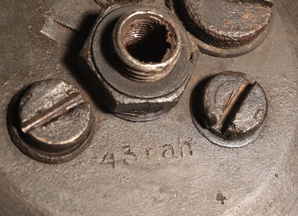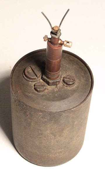Original WWII German SMi-35 bounding mine. The mine consists of an outer cannister which fits the inner bounding mine very exactly. Top of the mine has a date 43 and maker code dah for Junkers & Co. GmbH of Dessau. Fuze assembly with traditional three prong detonator. Based on weight this mine is full of round shrapnel balls, not ball bearing replacements. Superb example. Completely inert.