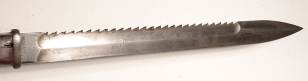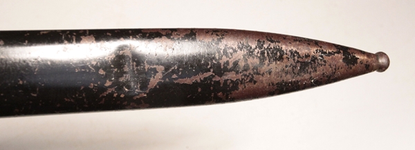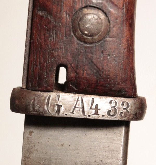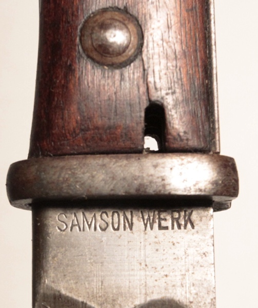 Made by Samson-Werke, Suhl and marked Samsom Werk. Crossguard regimentally marked 1G.A.4.33. Grip has flashguard. Sawback blade in very good condition. Steel scabbard retains much original black paint and is in good condition with one dent shown in photo.