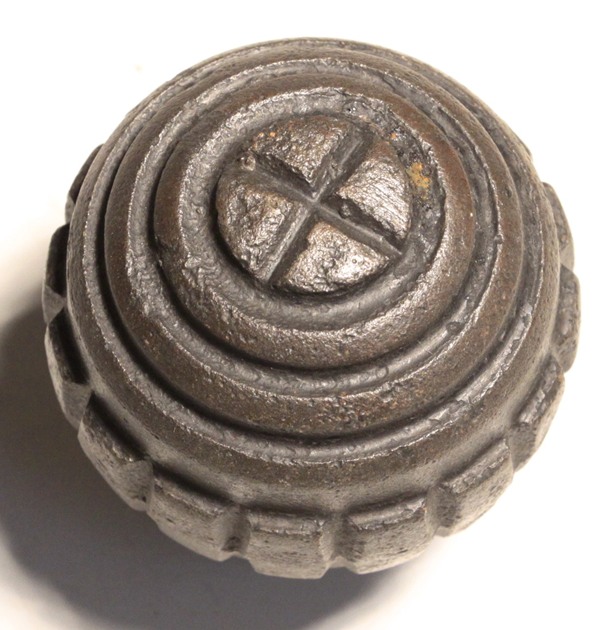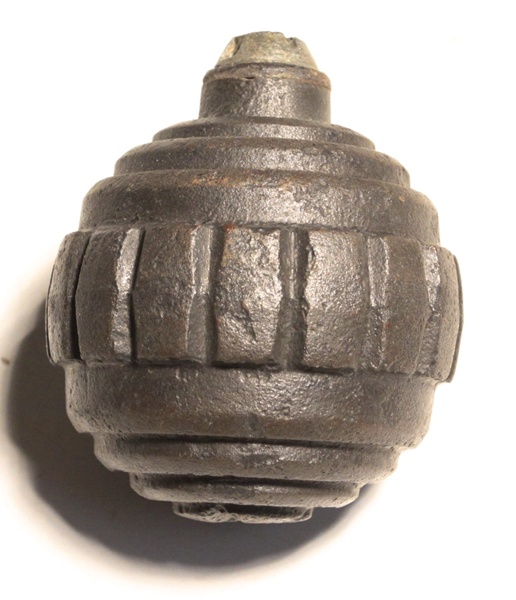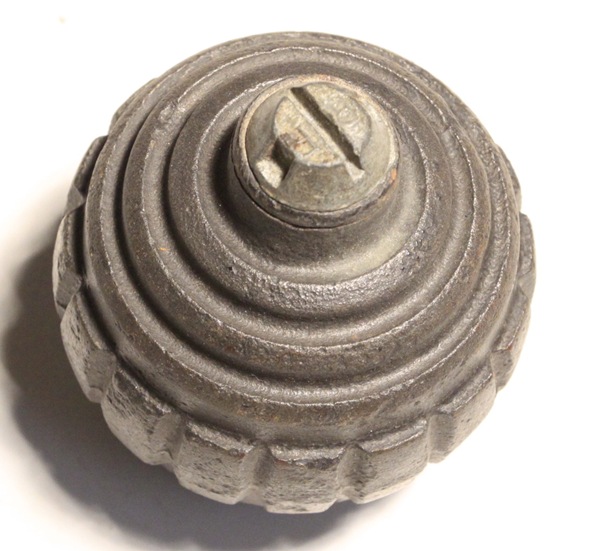 Imperial German World War One handgrenade with heavily segmented body. Excellent condition and not dug up or excavated artifact. Comes with zinc alloy transit plug including leather sealing washer which is removable to verify this item is empty and inert.