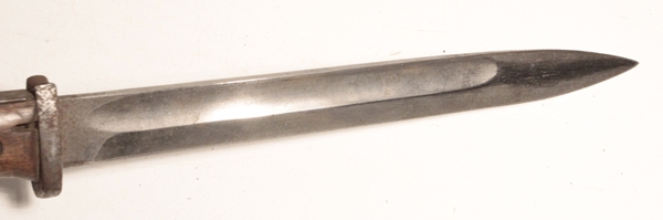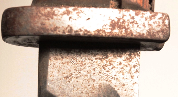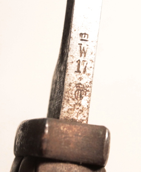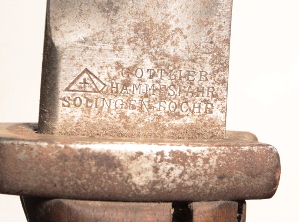 Original veteran bringback in original untouched condition, has never been cleaned. Note the frog is a British Pattern 1914 leather frog. Original WWI Got Mit Uns brass buckle. Bayonet is 1884/98, maker is Gottlieb Hammesfahr with their pyramid logo trademark. The opposite side bears a knight in armour on a running horse with the name BAYARD below which is the trademark of a Belgian firm, Pieper who made the actual blade and used the Bayard trademark. Spine is marked Crown over W and dated 1917.