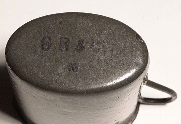 Original enameled canteen cup Model 1916 maker marked G.R. & Co. 16, dated 1916. Called 1916 Trinkbecher. Very good condition.