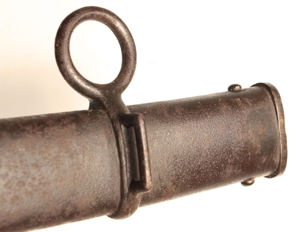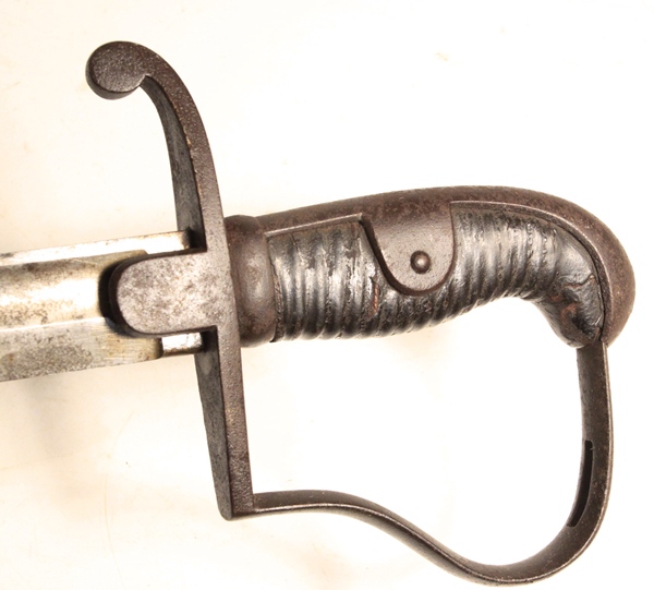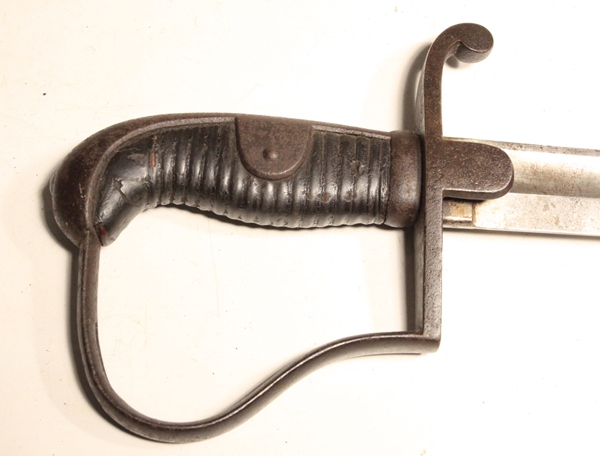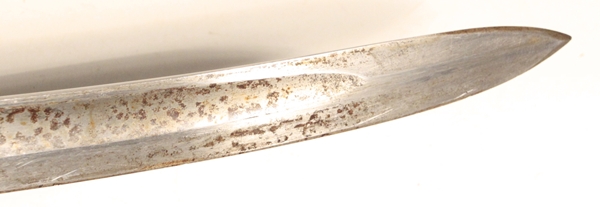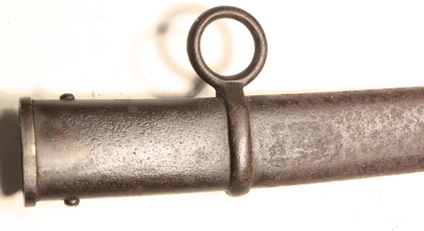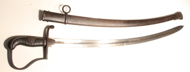 Believed to be a New Model (nA Neue Art) with no date or model designation marked on the sword. Marking is on the spine, Crown over W and date 06. Crossguard has Crown over B marking. Overall 25 inches, blade is curved and 29 ¾ inches long. The scabbard has one fixed ring and lateral band. Grips are black leather covering wood. There are no unit markings on the sword or scabbard.