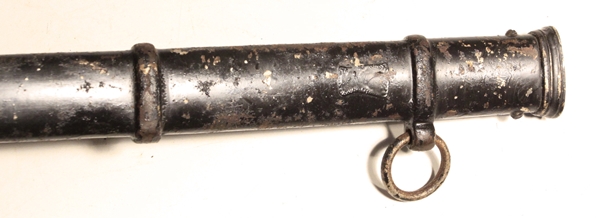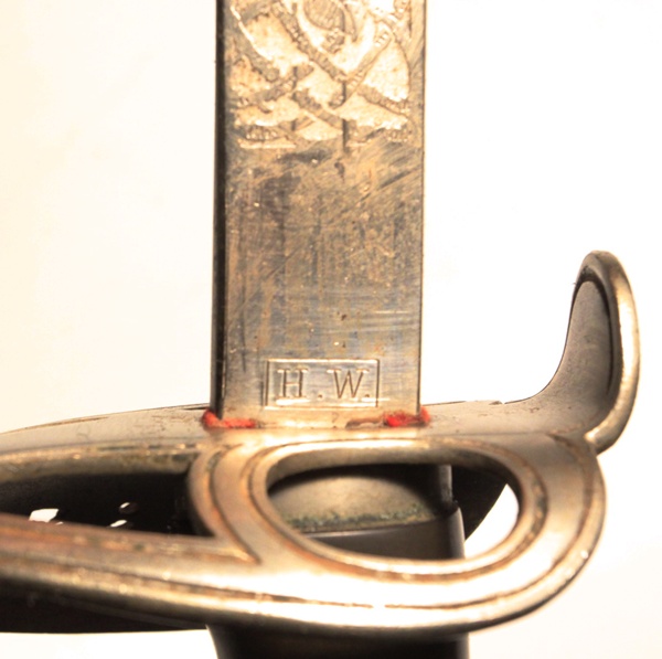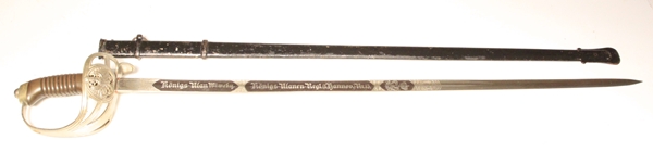 Original Imperial German Cavalry sword with Prussian eagle on handguard basket. Grip is brown plastic in very good condition. Blade length 32 inches, 37 inches overall length. Each side of blade is etched with Regimental motifs and battle honours. Maker initials in rectangle H.W. Very good condition and quite a historically interesting sword clearly serving in WW1. Steel scabbard is painted black and likely done at the start of WW1.