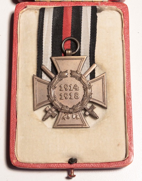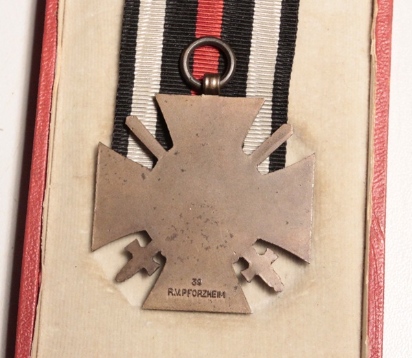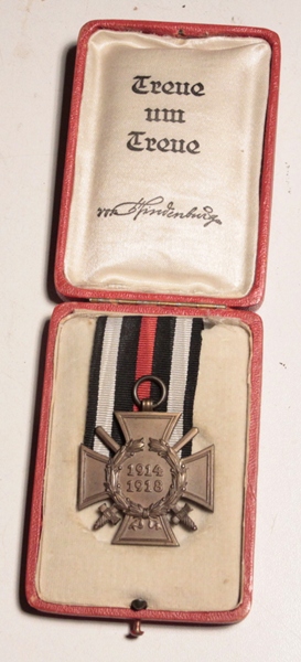 Service medal created by the Third Reich for soldiers who service in World War One. Comes with original ribbon. Cross in very good condition and maker marked 39 over R.V. Pforzheim. Presentation case is in very good condition and printed inside “True um True” meaning Loyalty for Loyalty, over signature of von Hindenburg.
