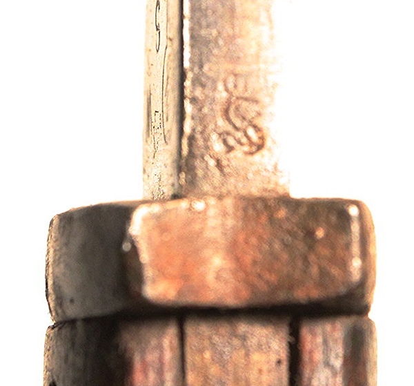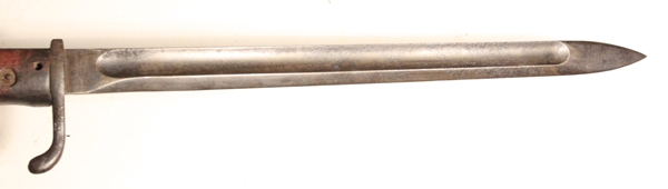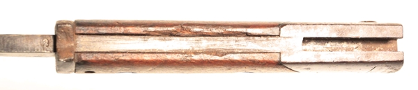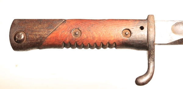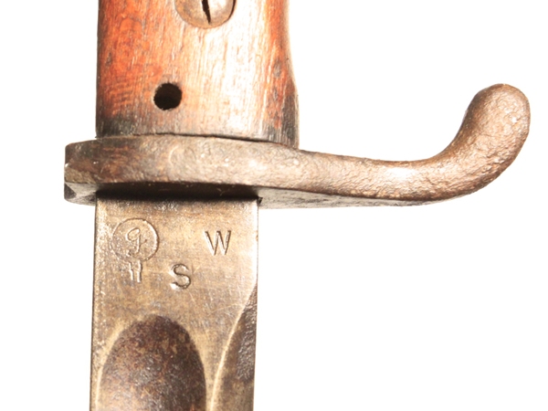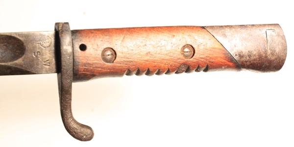 Designed by Dr. Lucian Gottscho of Berlin and known as “The Machine-Gunner Bayonet” they were made in very limited numbers. Fits Gew 98 and Gew88 rifles. The bayonet has a clean 14 ½” long steel blade with fullers and is 19 ¾” overall length. Ricasso marked with S, W and a g inside a “vacuum tube” reportedly the mark of Dr. Lucian Gottscho, Berlin. The spine has an Imperial inspection mark. One piece wrap around wood grip.