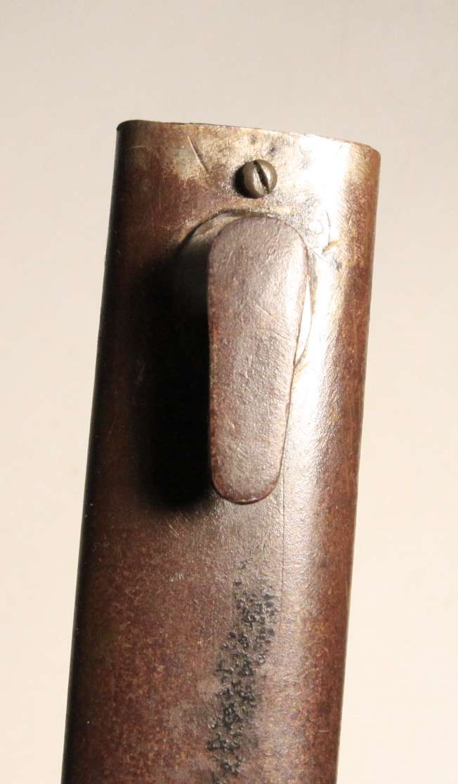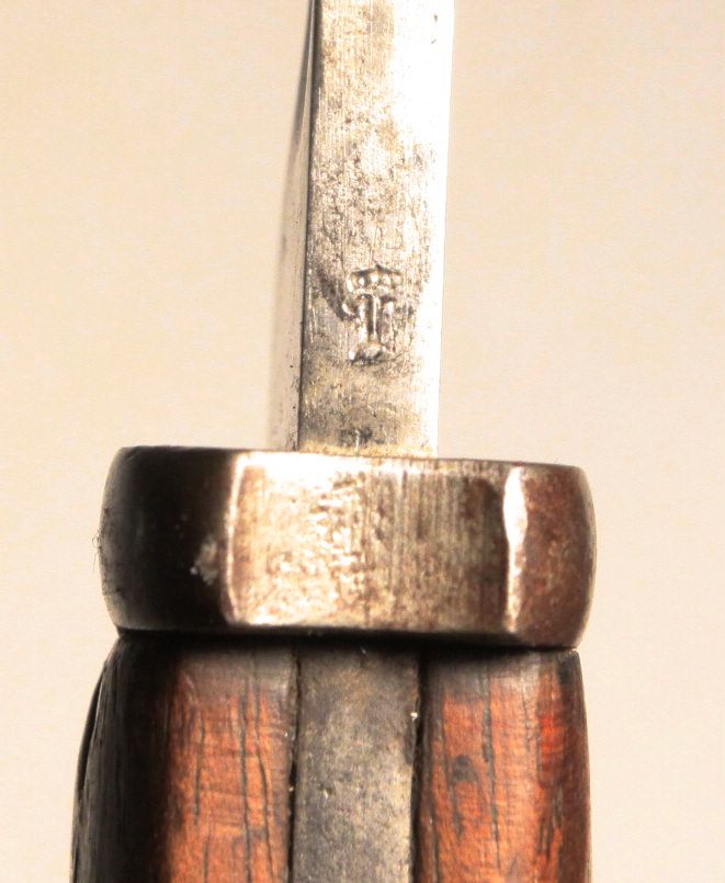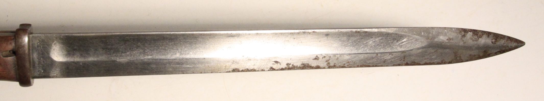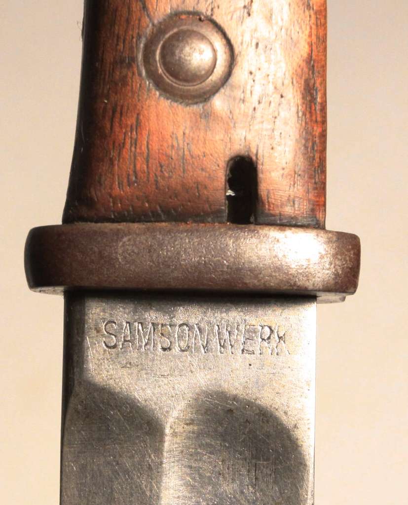 Early German WW1 bayonet pressed into use as an “Interim Bayonet” due to shortage of rifles and bayonets at the start of the war. Numerous small shops made these. This specimen is made by Samsonwerk of Berlin, one of the largest makers of S14 bayonets. Spine of blade has proof mark. Steel scabbard appears to be ersatz.