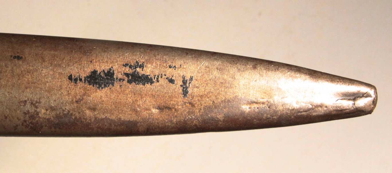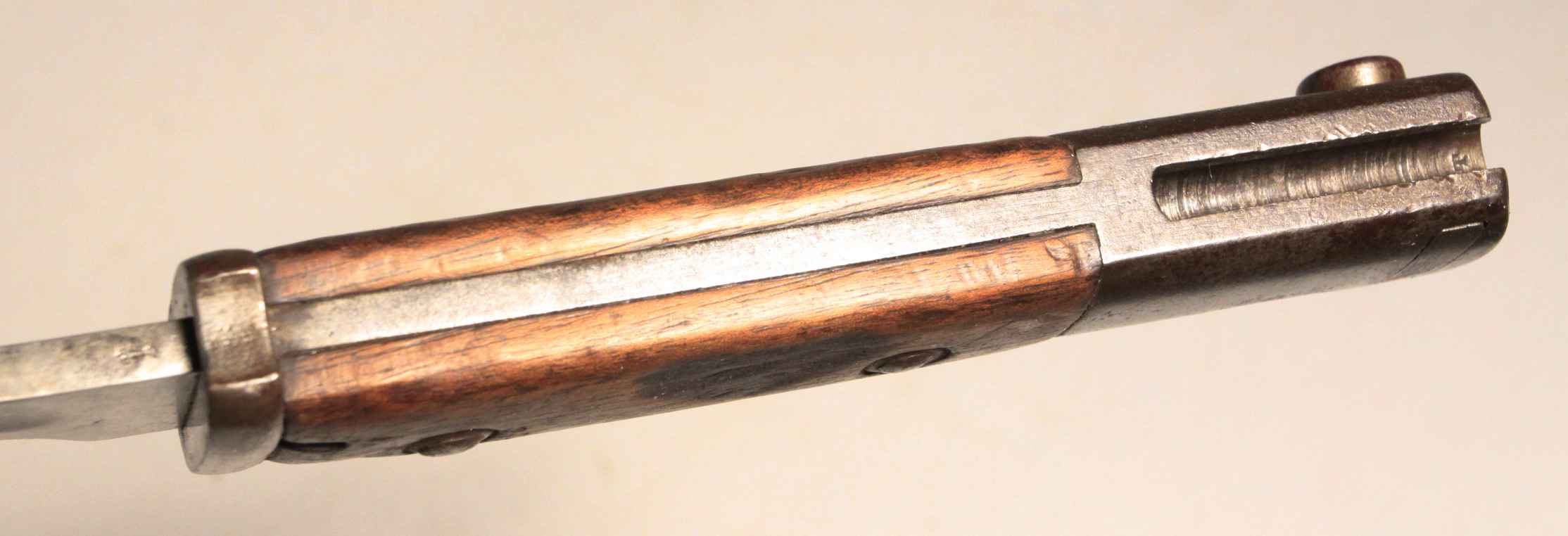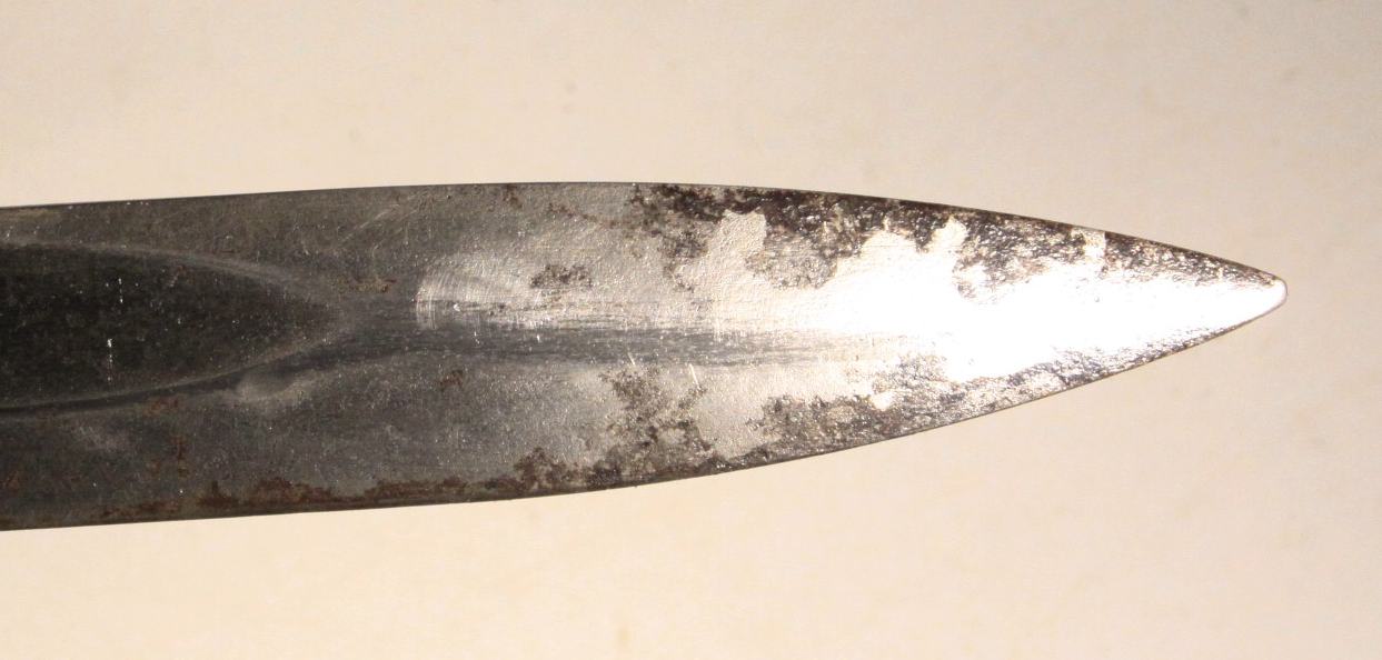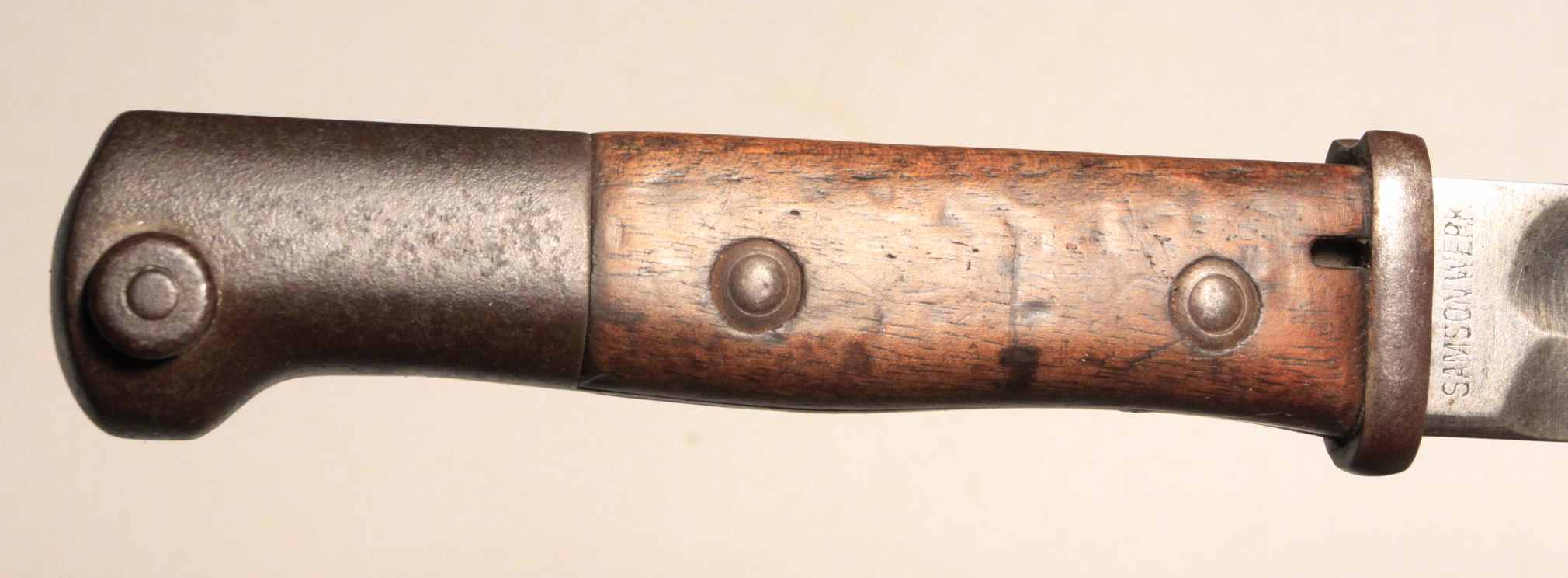 Early German WW1 bayonet pressed into use as an “Interim Bayonet” due to shortage of rifles and bayonets at the start of the war. Numerous small shops made these. This specimen is made by Samsonwerk of Berlin, one of the largest makers of S14 bayonets. Spine of blade has proof mark. Steel scabbard appears to be ersatz.