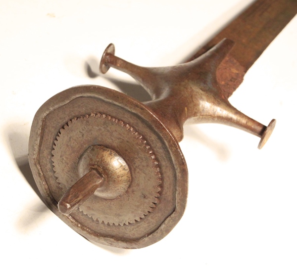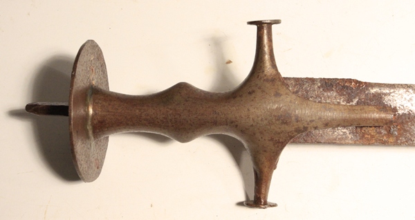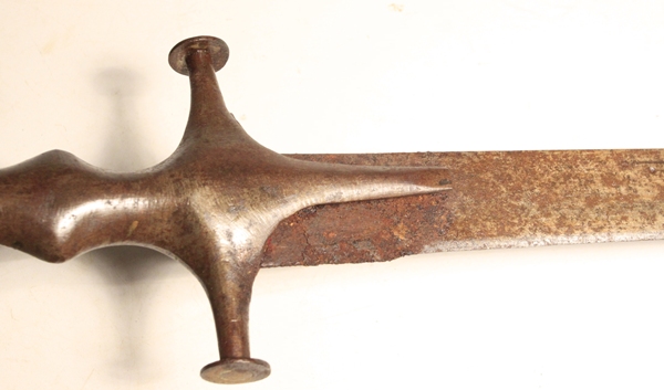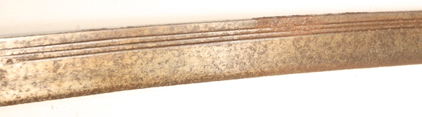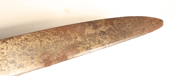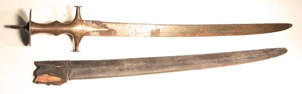 Original decorative pattern grip. Blade has no markings. Straight blade is 29 1/2 inches long. Overall 35 ½ inches. Comes with relic condition leather covered wood scabbard for display only.