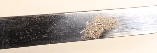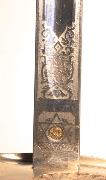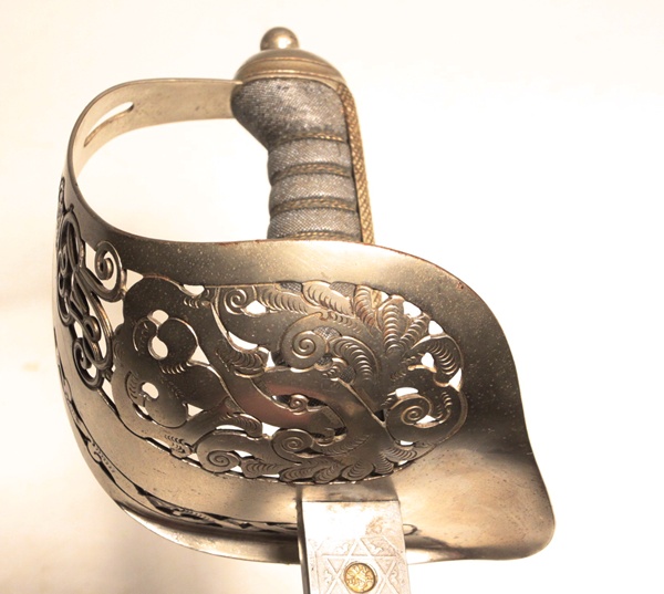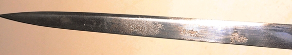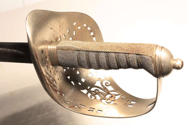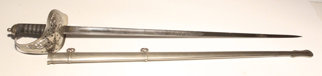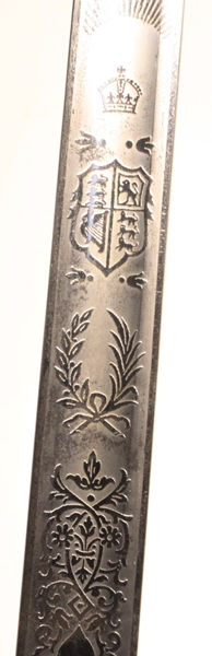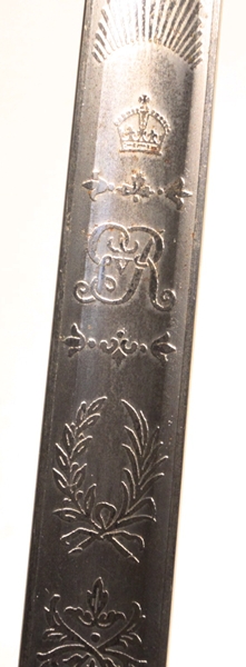 P1897 style officer’s dress sword with 32 inch blade, 38 inches overall length. Etched George V cypher on blade. Blade in good condition with spots of corrosion as pictured in photos. Steel dress scabbard is in very good condition.