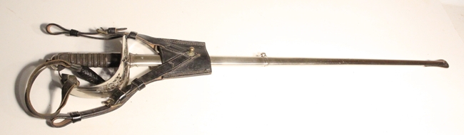 George V cypher in dress steel scabbard with leather hanger and knot. William Scully Ltd, Montreal is retailer. A picquet weight sword, also called a levee weight is shorter and lighter than a full sword and was used for social functions or wear during peacetime guard duty. Blade length 30 inches, width ¾ inch, overall sword length 35 inches. Used, very good condition. Scabbard has very minor dent and some wear/corrosion beneath the hanger.