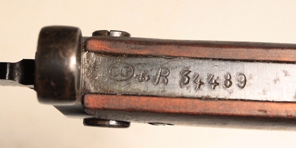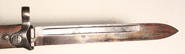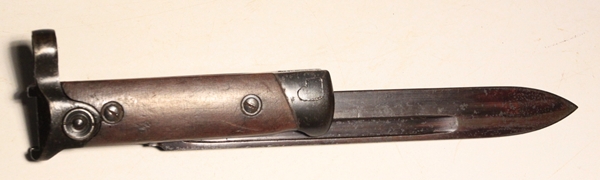 Very unique folding blade bayonet for Mannlicher Carcano 1938 carbine. Blade folds back along the handle while the bayonet is fixed to the rifle. Complete with scabbard which is seldom seen with this model. Used, good condition, blade shows corrosion.